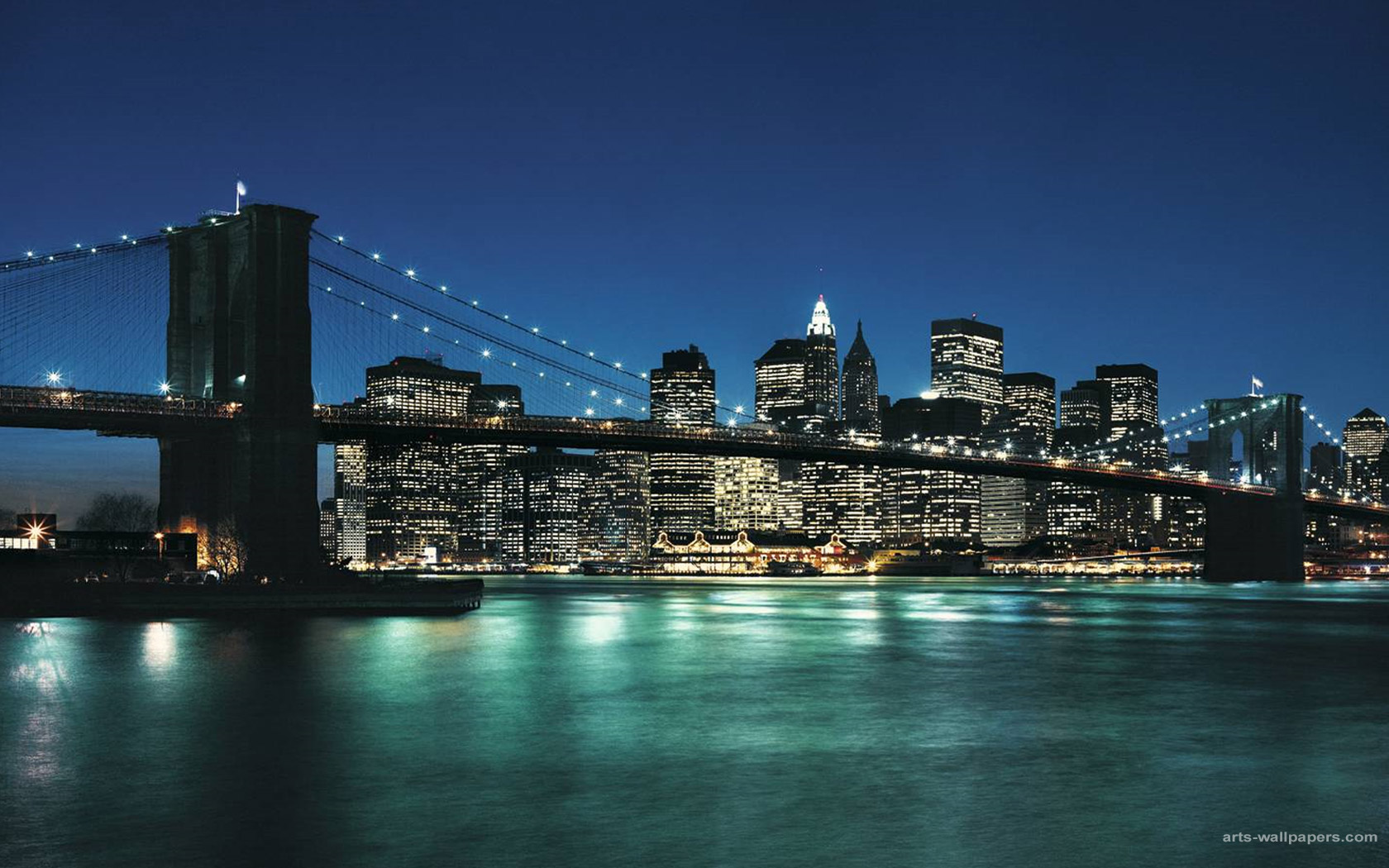 Description: A city skyline at night with a bridge and a boat in the water below it and a bridge in the foreground.