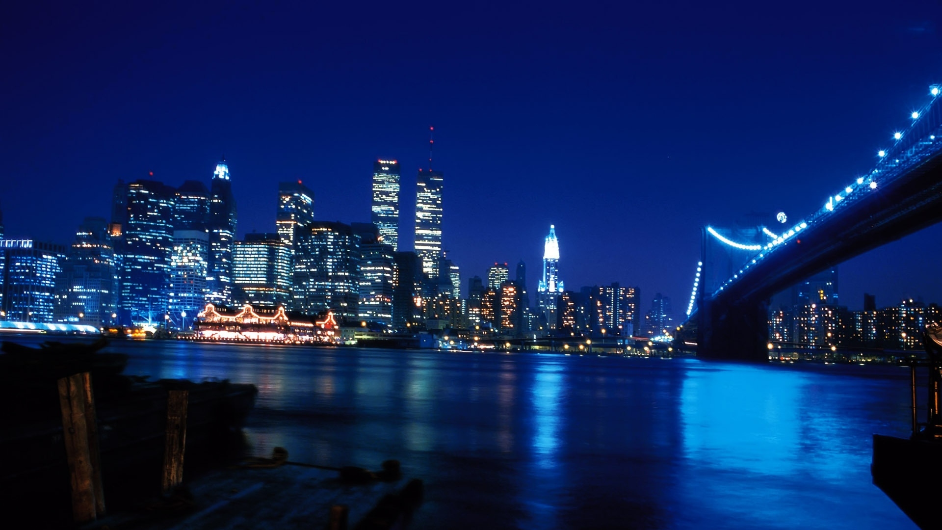 Description: A city skyline at night with a bridge and a river in the foreground and a bridge in the foreground.