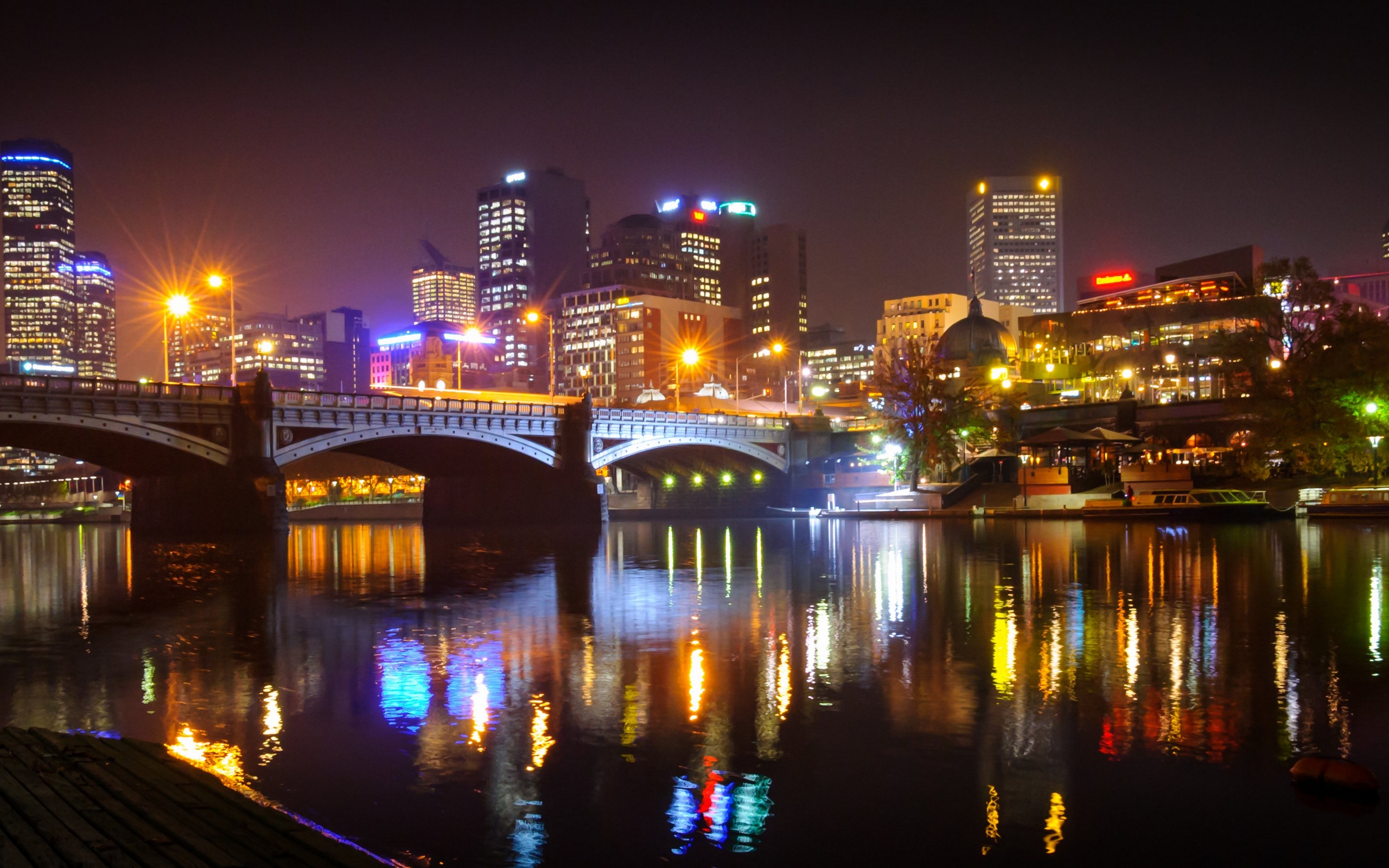Description: A city skyline at night with a bridge over a river and a bridge over a river with lights on.