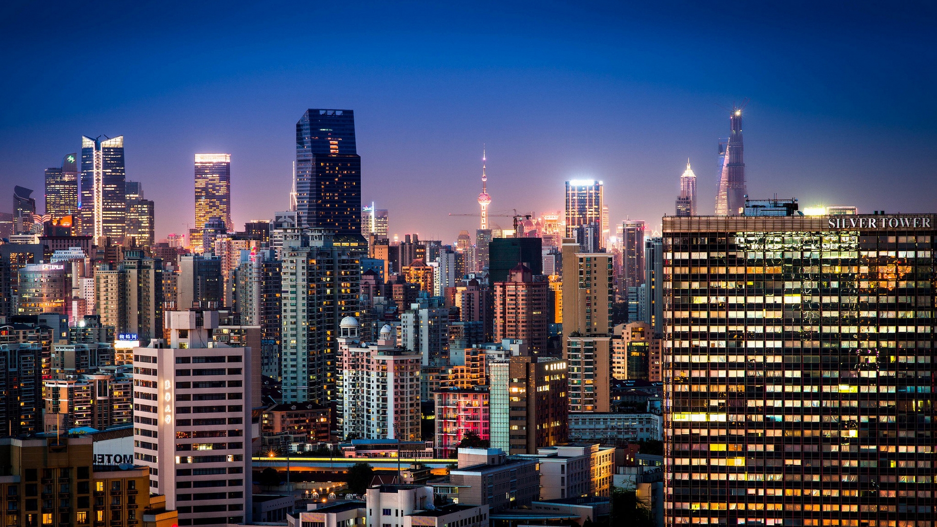 Description: A city skyline with a lot of tall buildings at night time with lights on them and a blue sky.