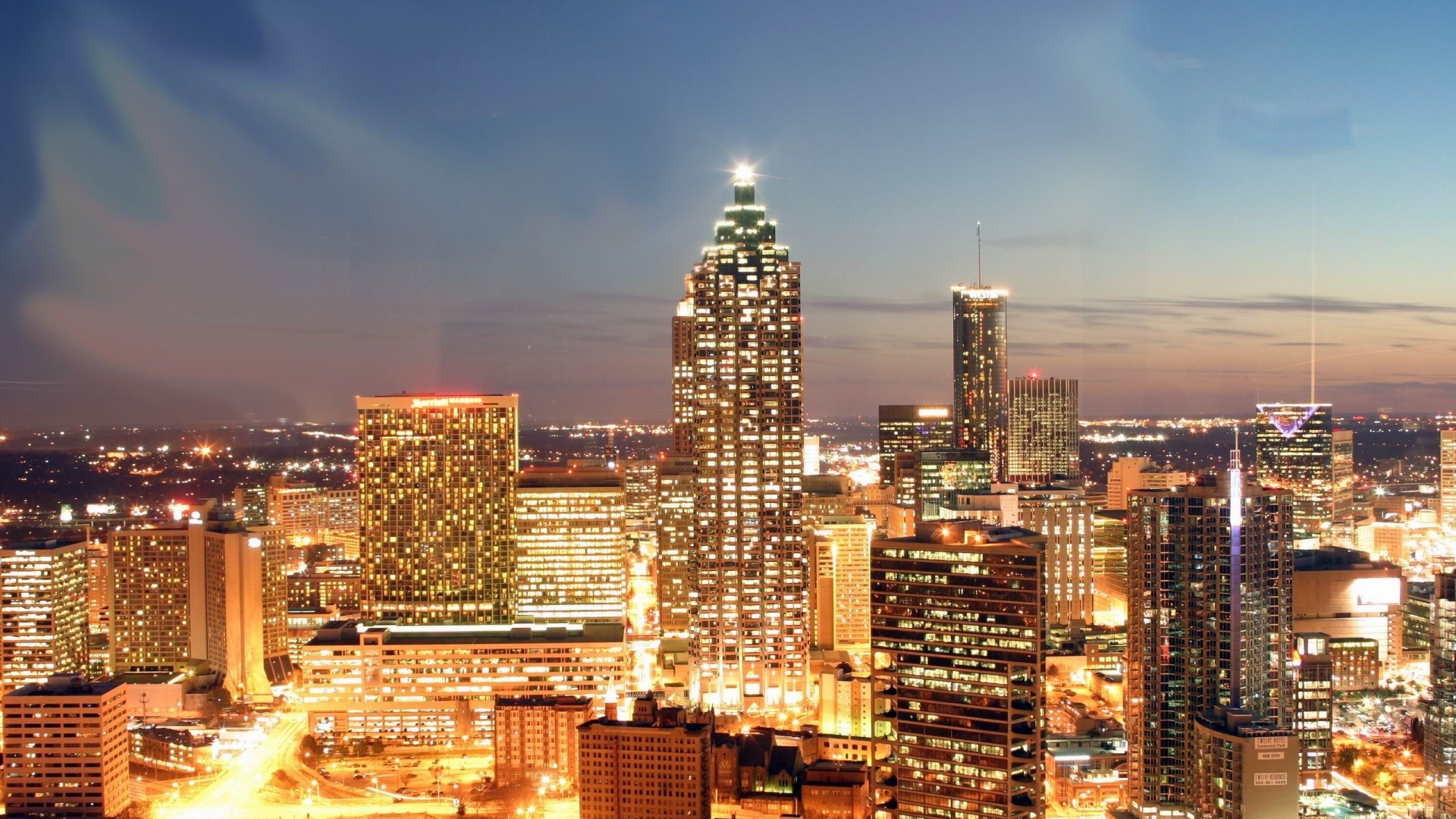 Description: A city skyline at night with a lot of lights on it and a lot of buildings in the background.
