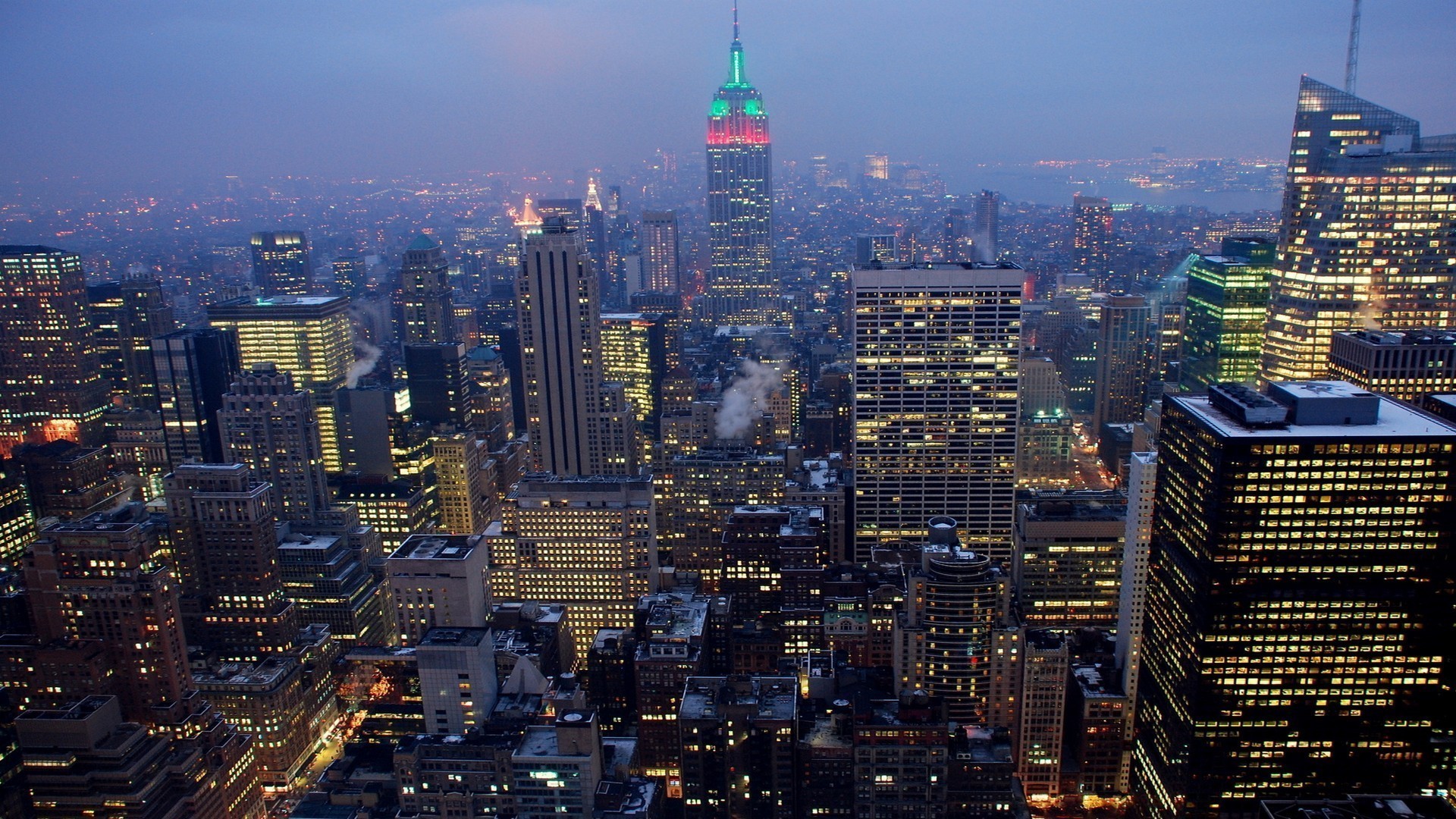 Description: A city skyline at night with a lot of lights on it and a lot of tall buildings in the background.