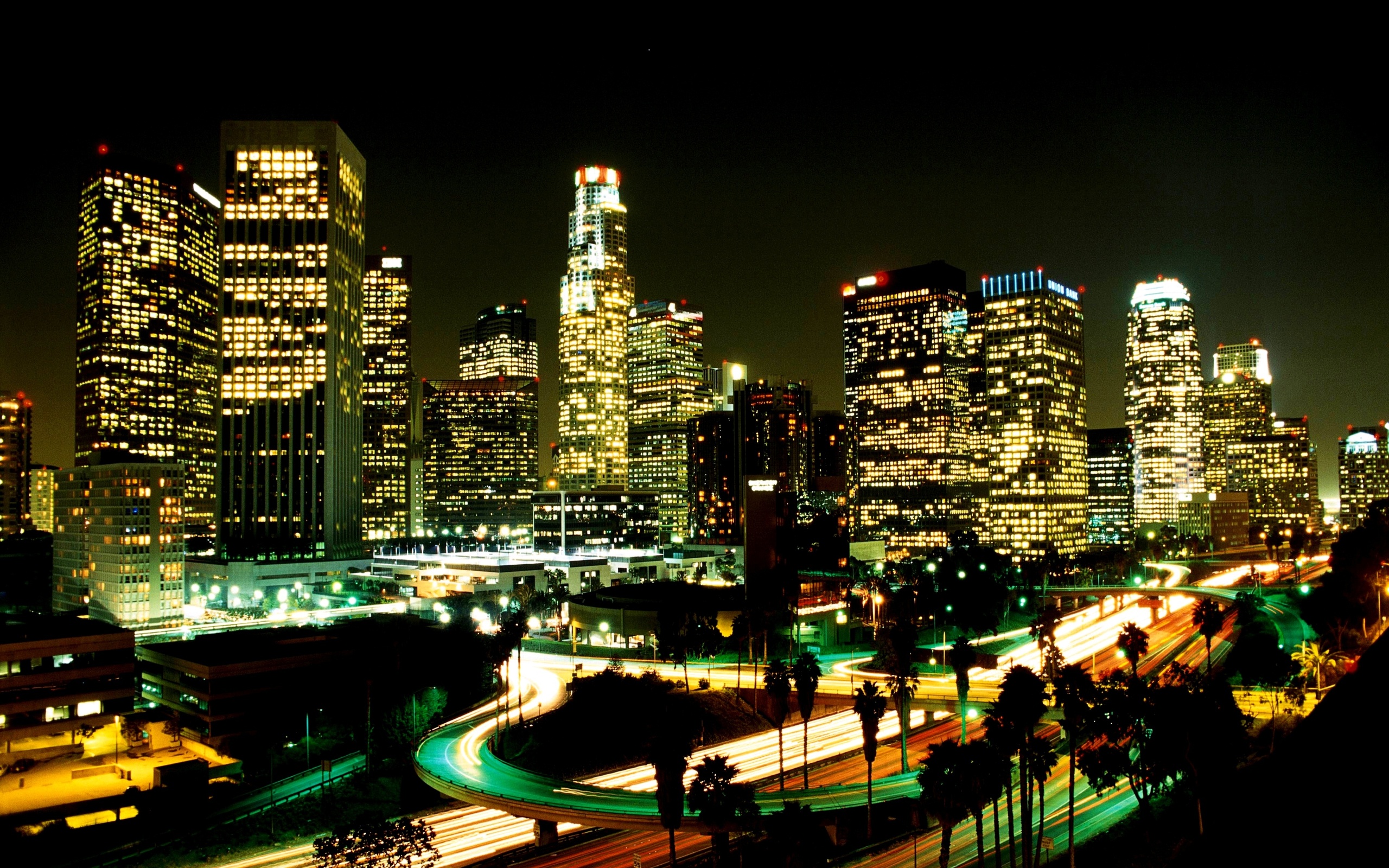 Description: A city skyline at night with a lot of lights on it and a lot of traffic on the road.