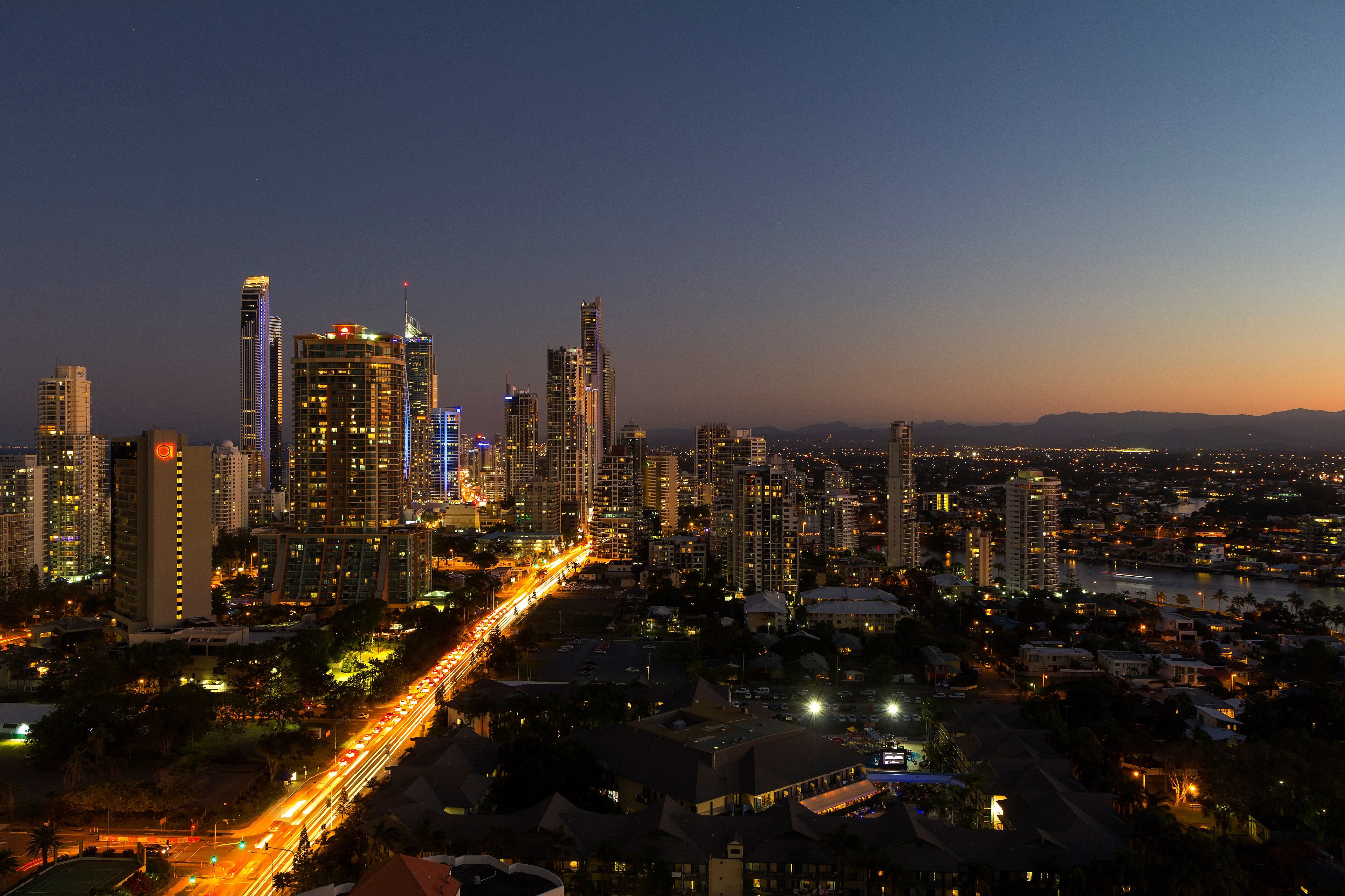 Description: A city skyline at night with a long exposure of the lights on the buildings and the street lights in the foreground.