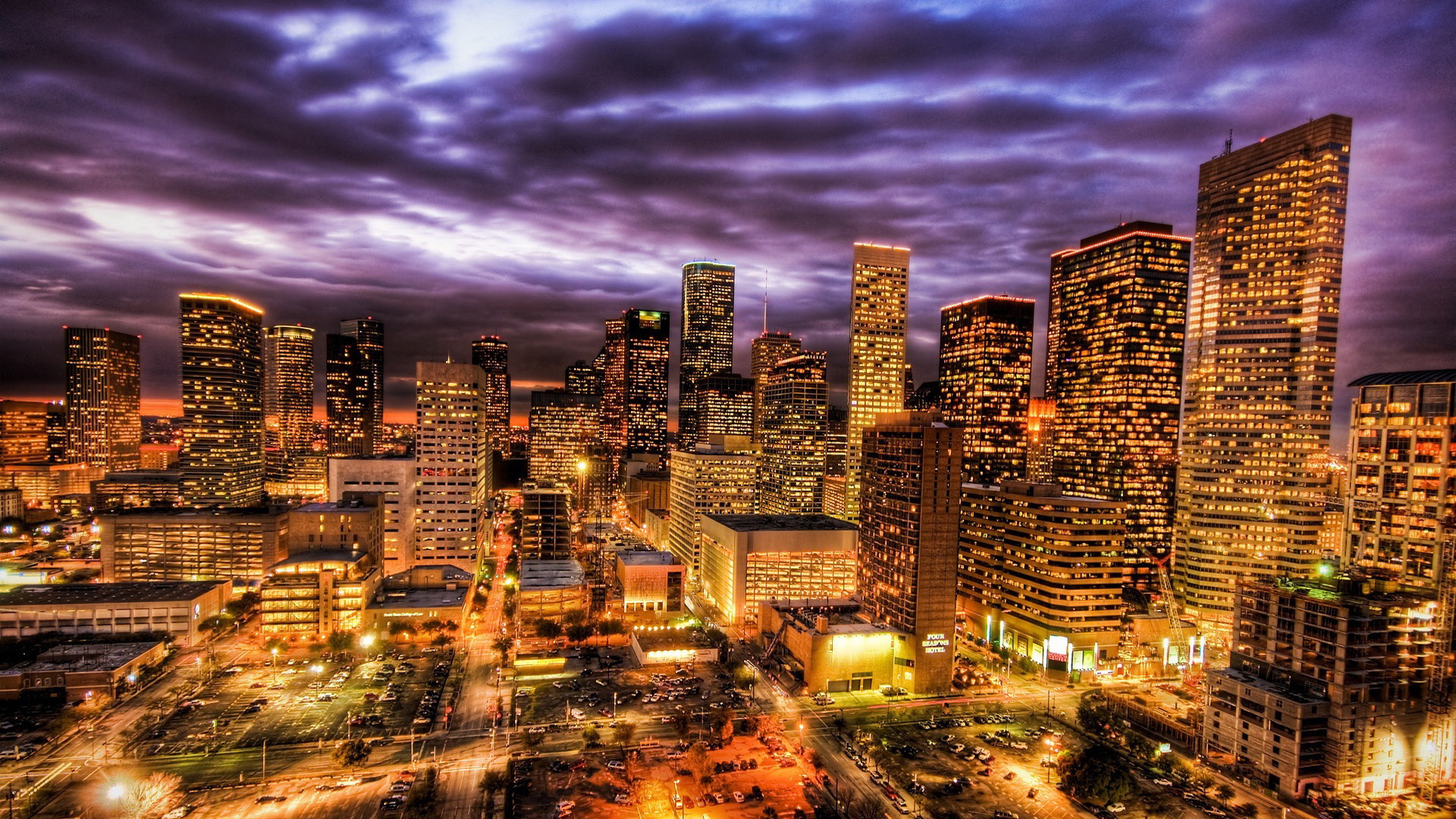 Description: A city skyline with a lot of tall buildings at night time with a purple sky in the background and a few clouds.