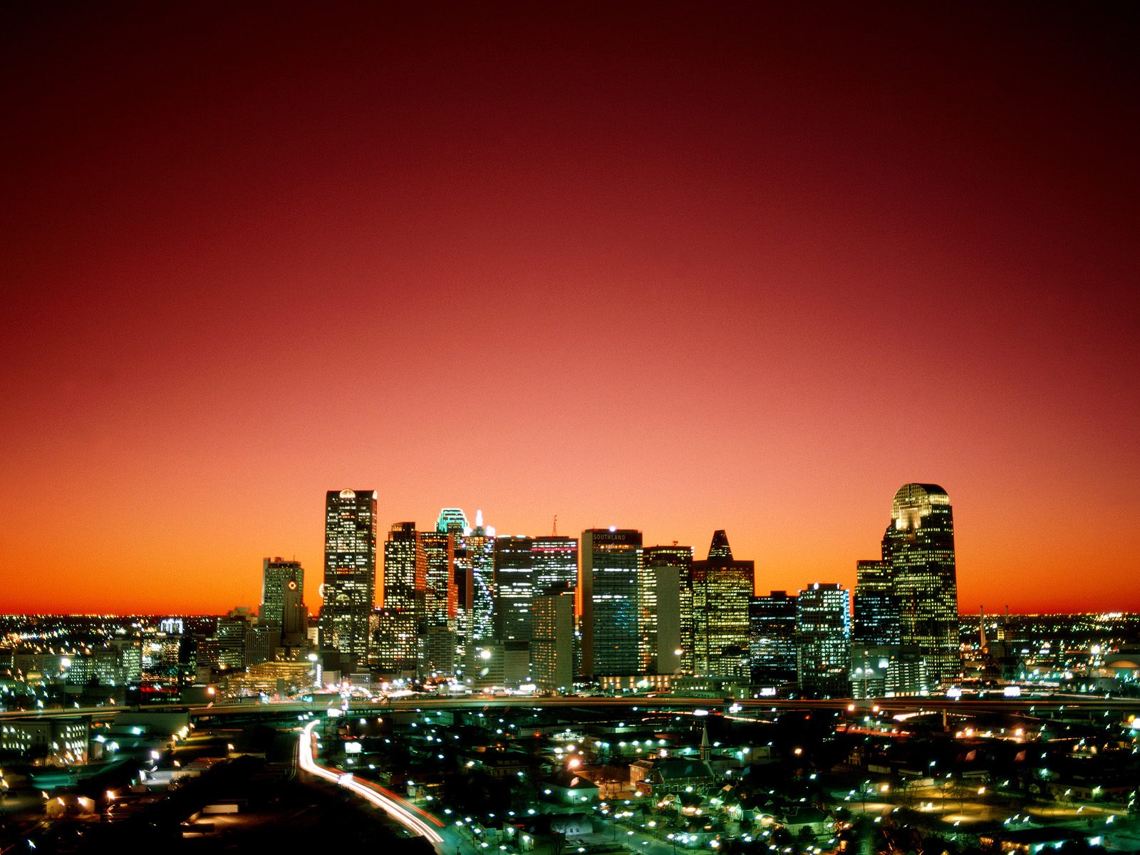 Description: A city skyline at night with a red sky in the background and a red sky in the foreground.