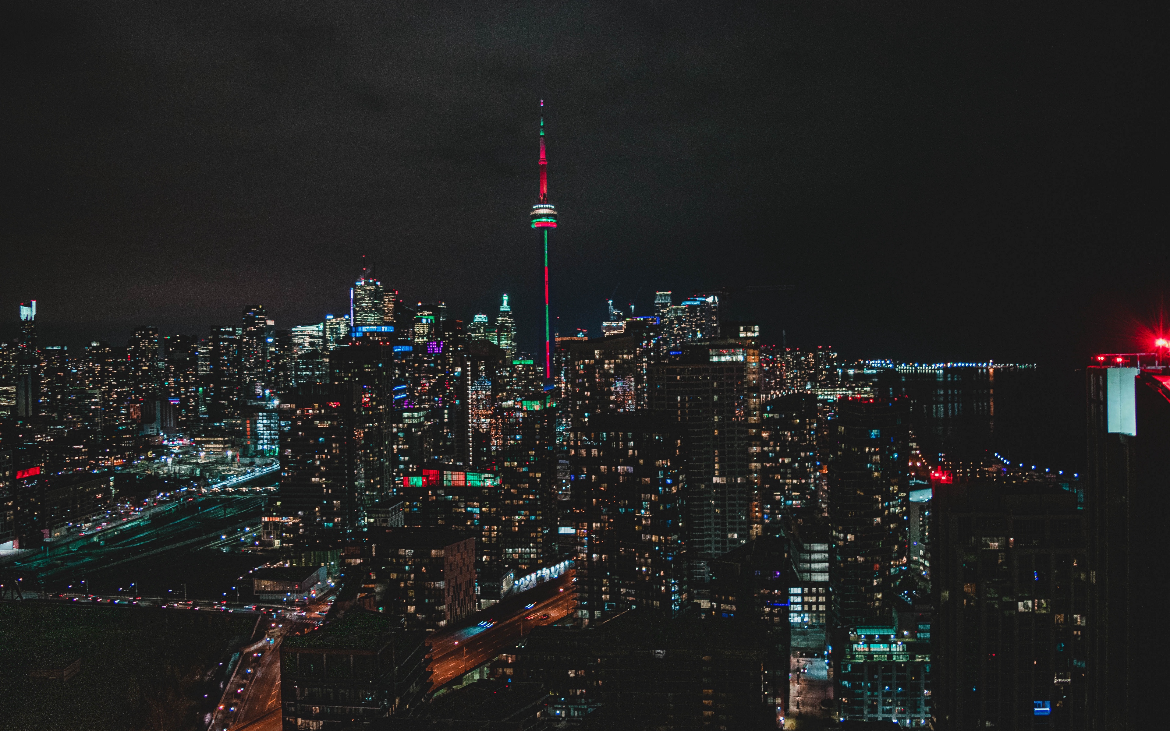 Description: A city skyline at night with a red light on it's side and a red traffic light on the other side.