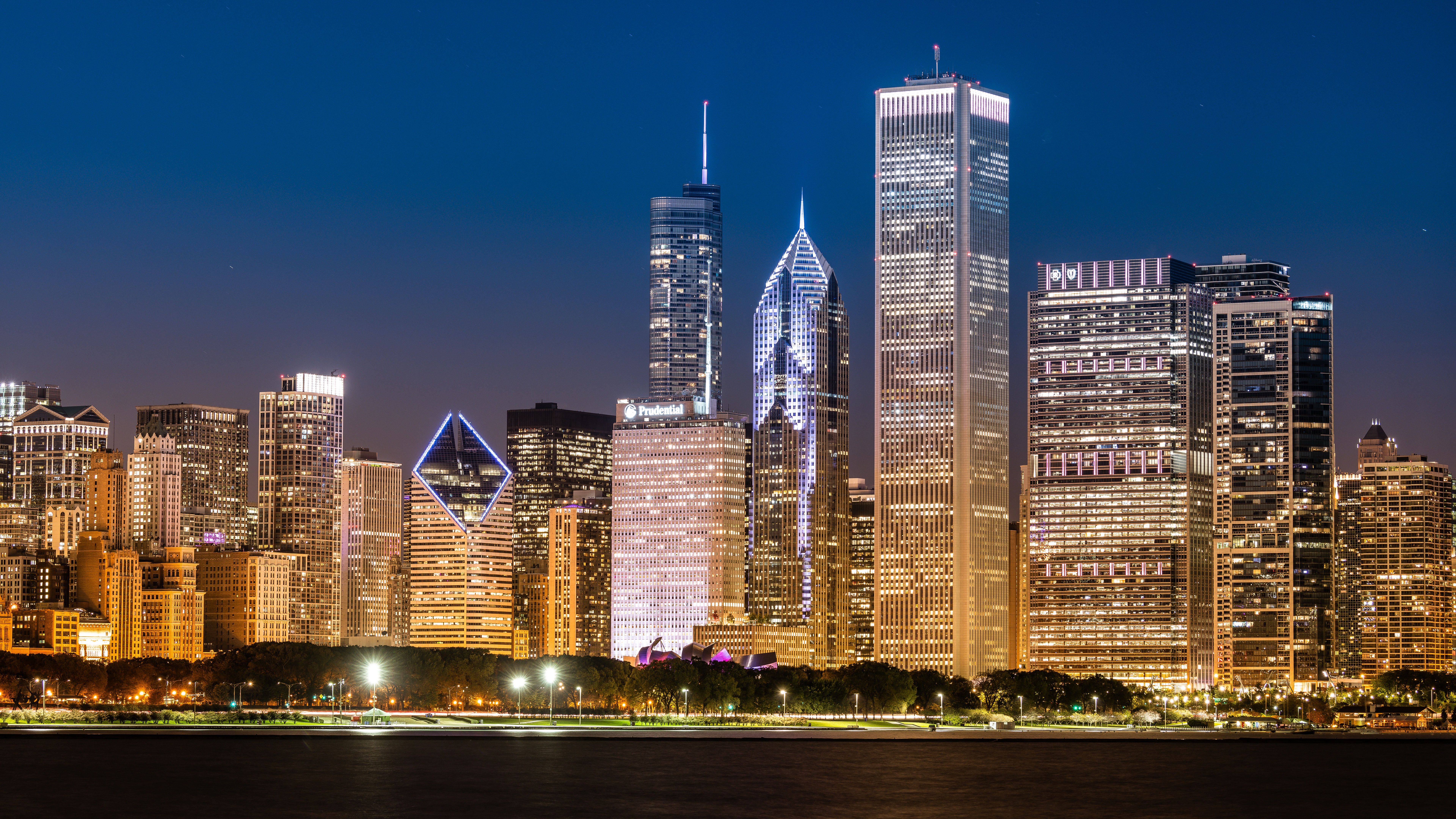 Description: A city skyline at night with skyscrapers lit up and reflecting in the water and a boat in the foreground.