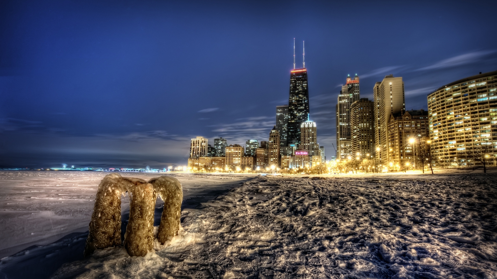 Description: A city skyline with a few buildings in the background at night time with snow on the ground and a few people walking on the sidewalk.