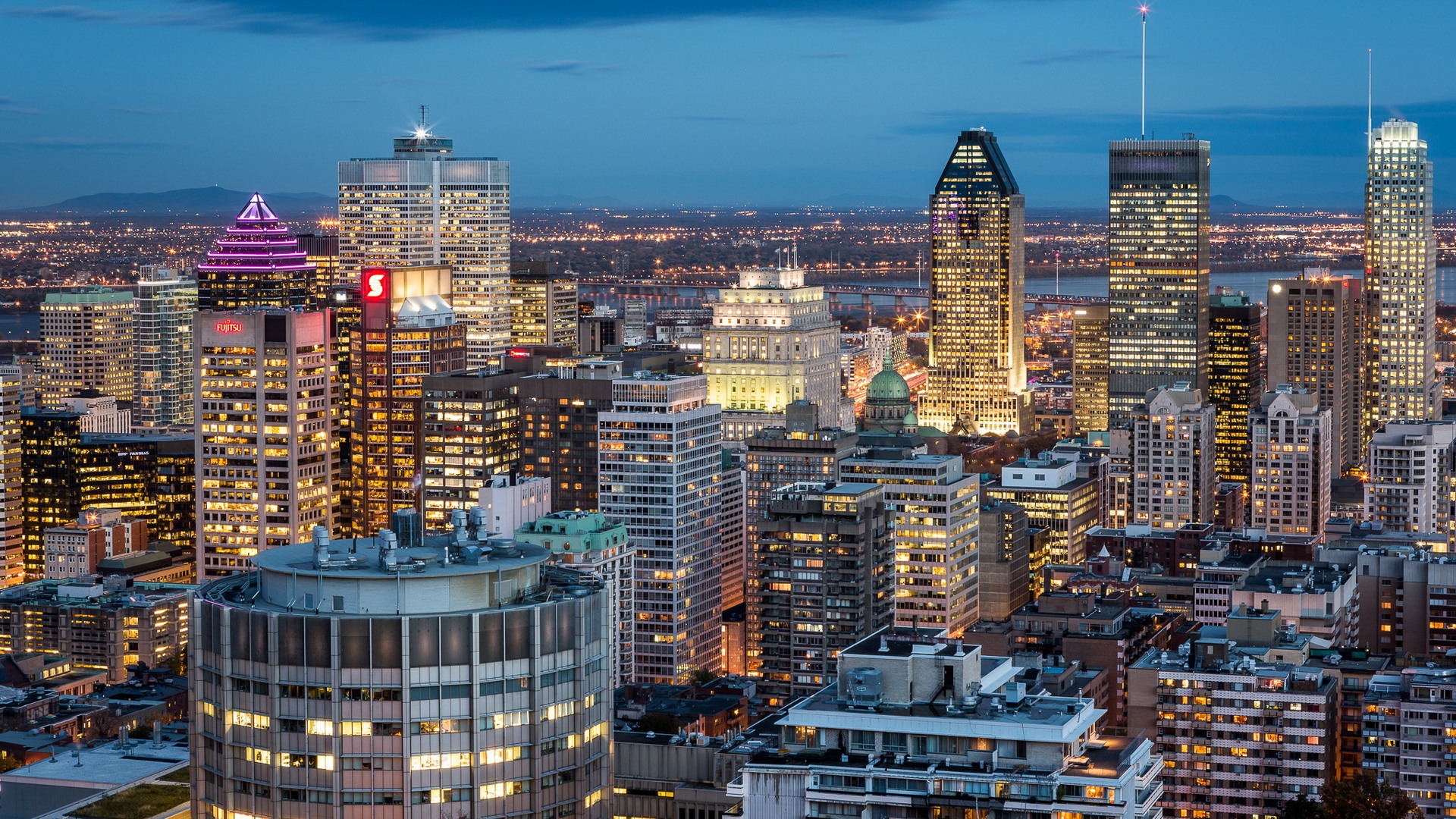 Description: A city skyline at night with a lot of tall buildings and lights on it's sides and a blue sky.
