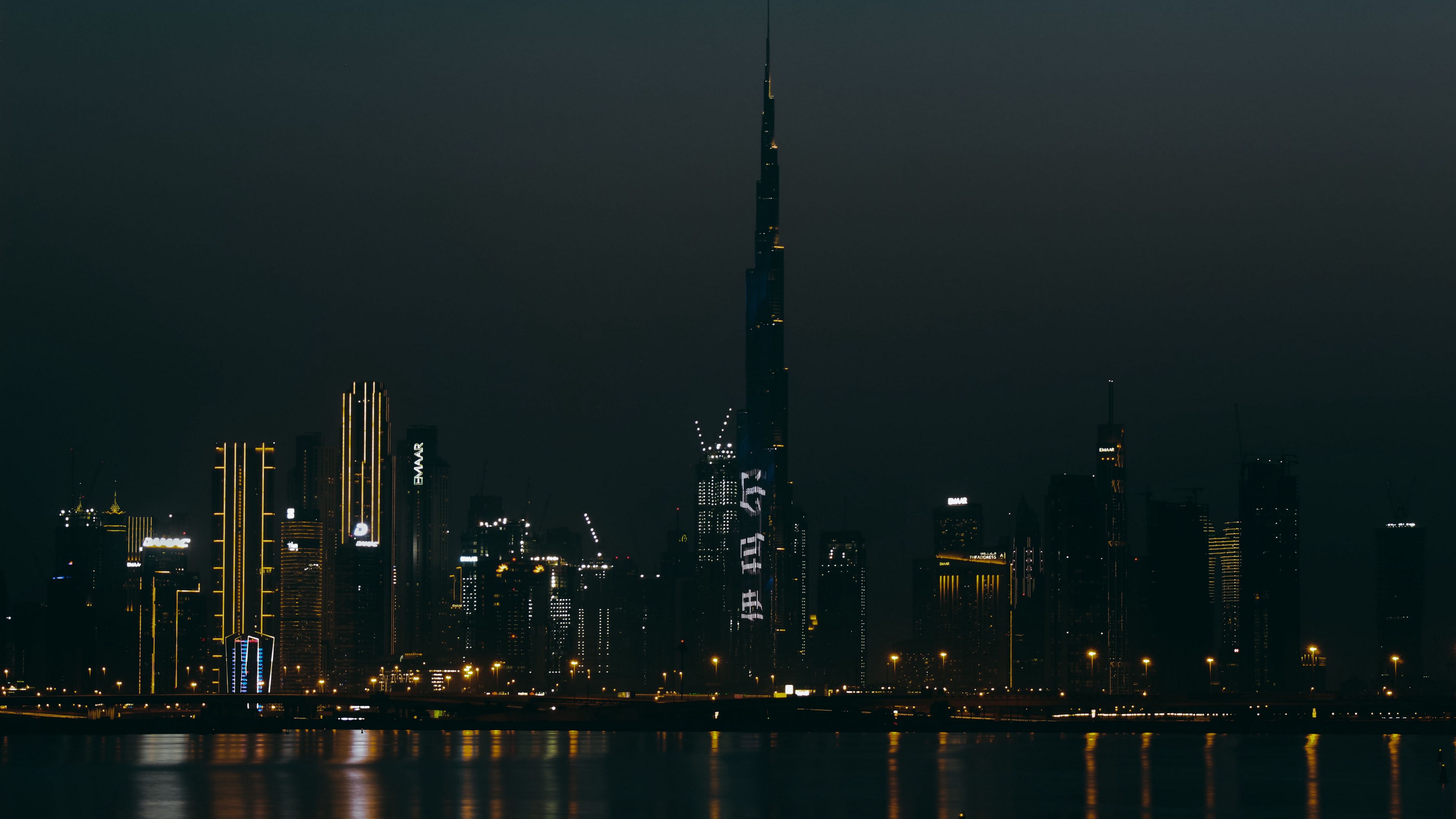 Description: A city skyline at night with a very tall building in the middle of the city and lights reflecting off the water.