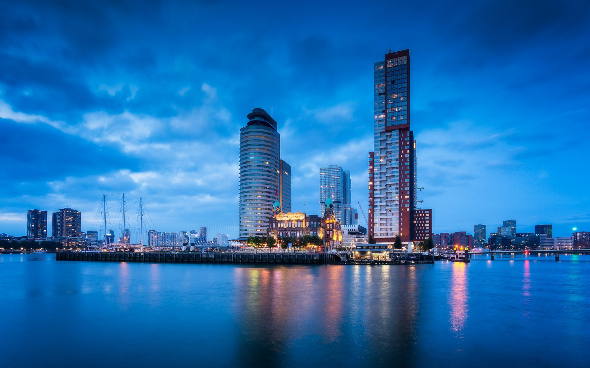Description: A city skyline with a body of water in front of it at night time with a blue sky and clouds.