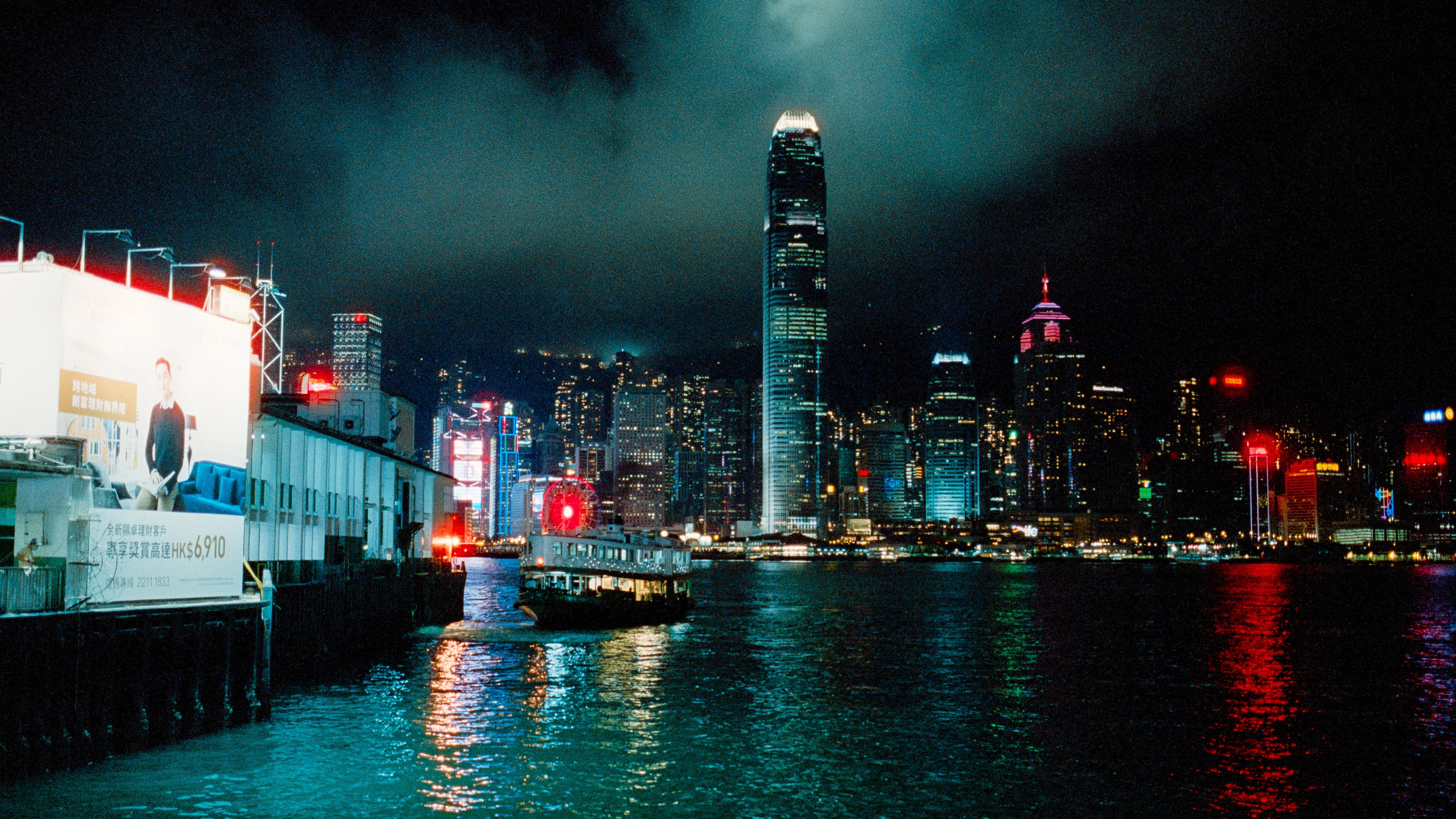 Description: A city skyline at night with a red light on the water and a boat in the foreground with a dark sky.