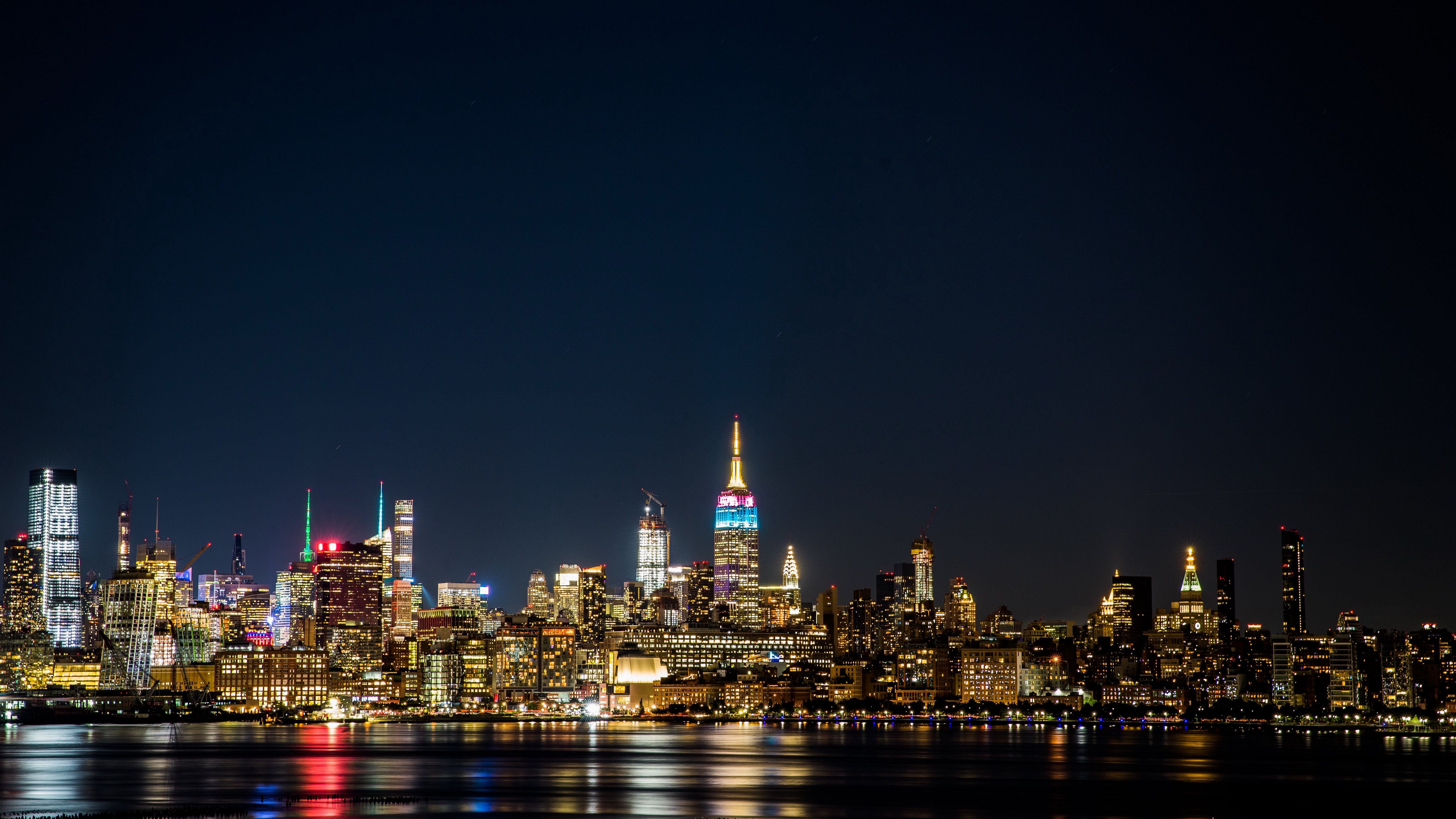 Description: A city skyline at night with a reflection of the water and lights on the buildings and the water surface.