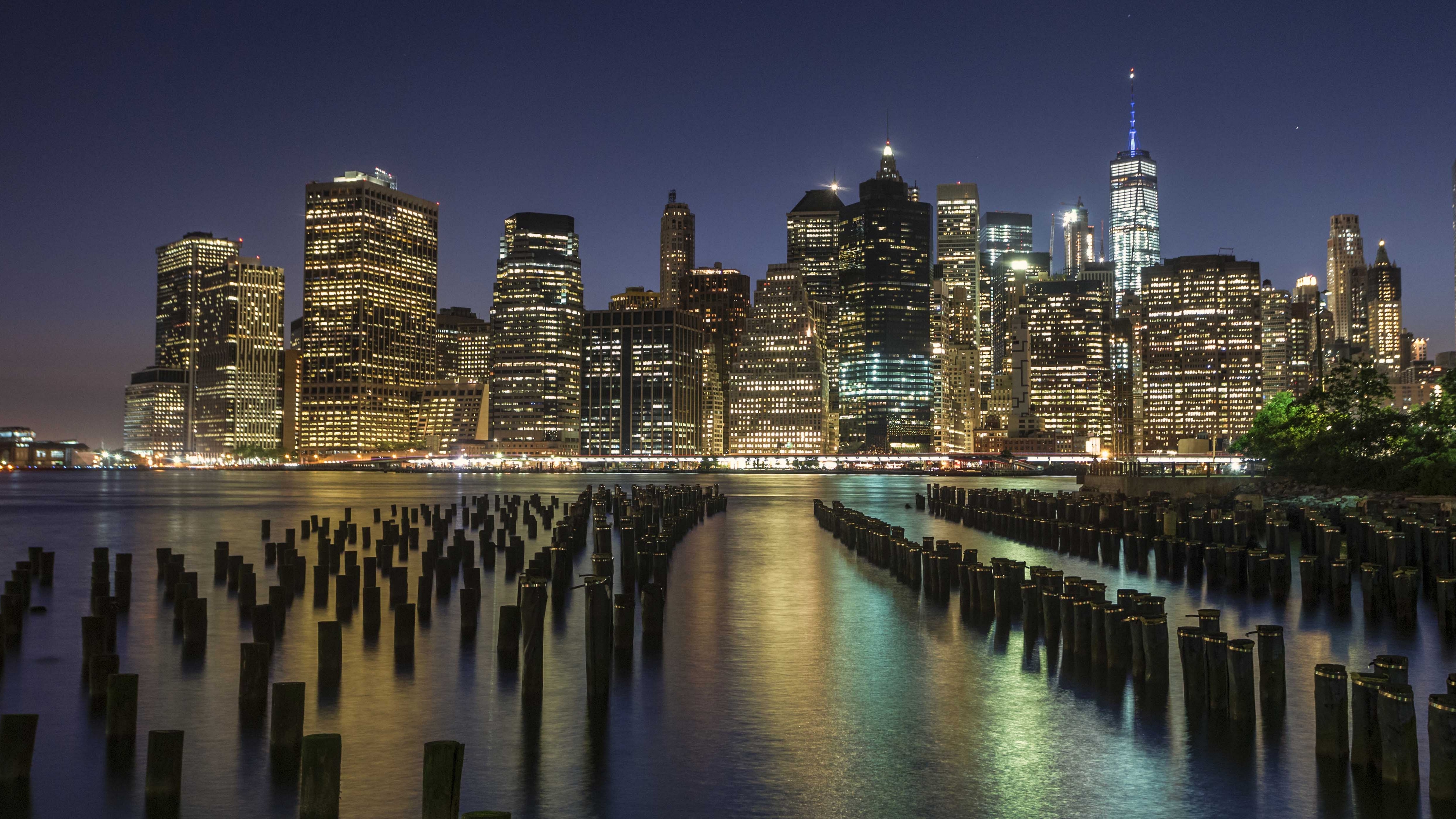 Description: A city skyline at night with a body of water in front of it and a lot of tall buildings.