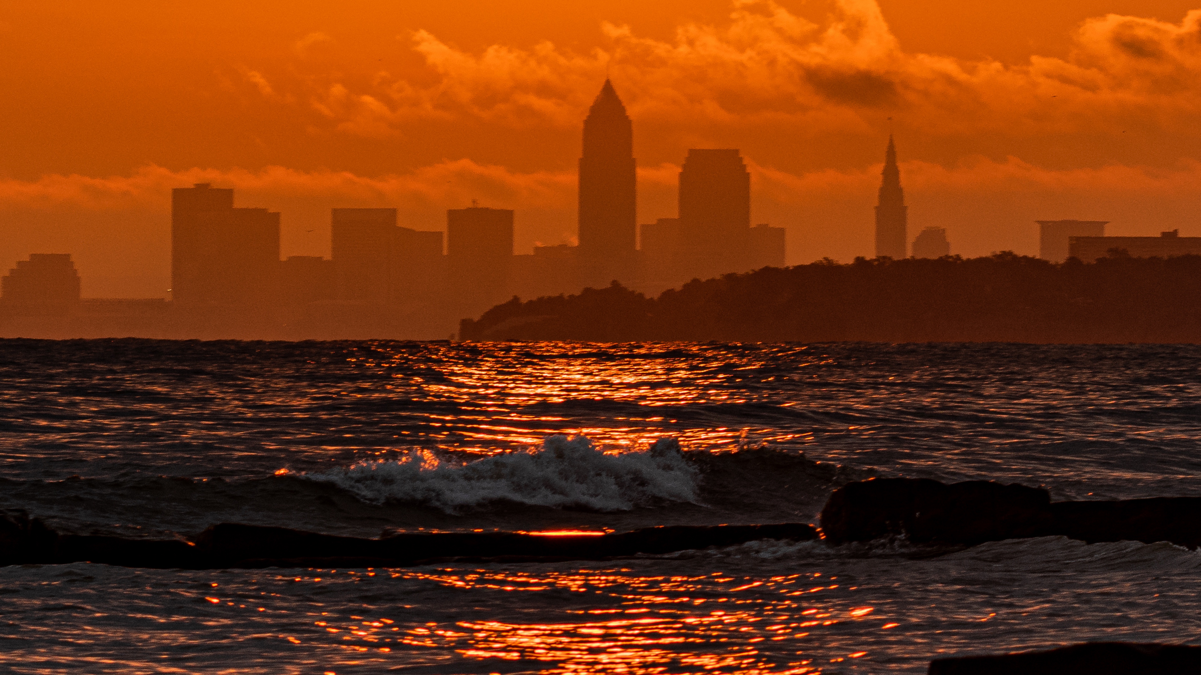 Description: A city skyline is seen in the distance as the sun sets over the ocean and waves crash on the rocks.