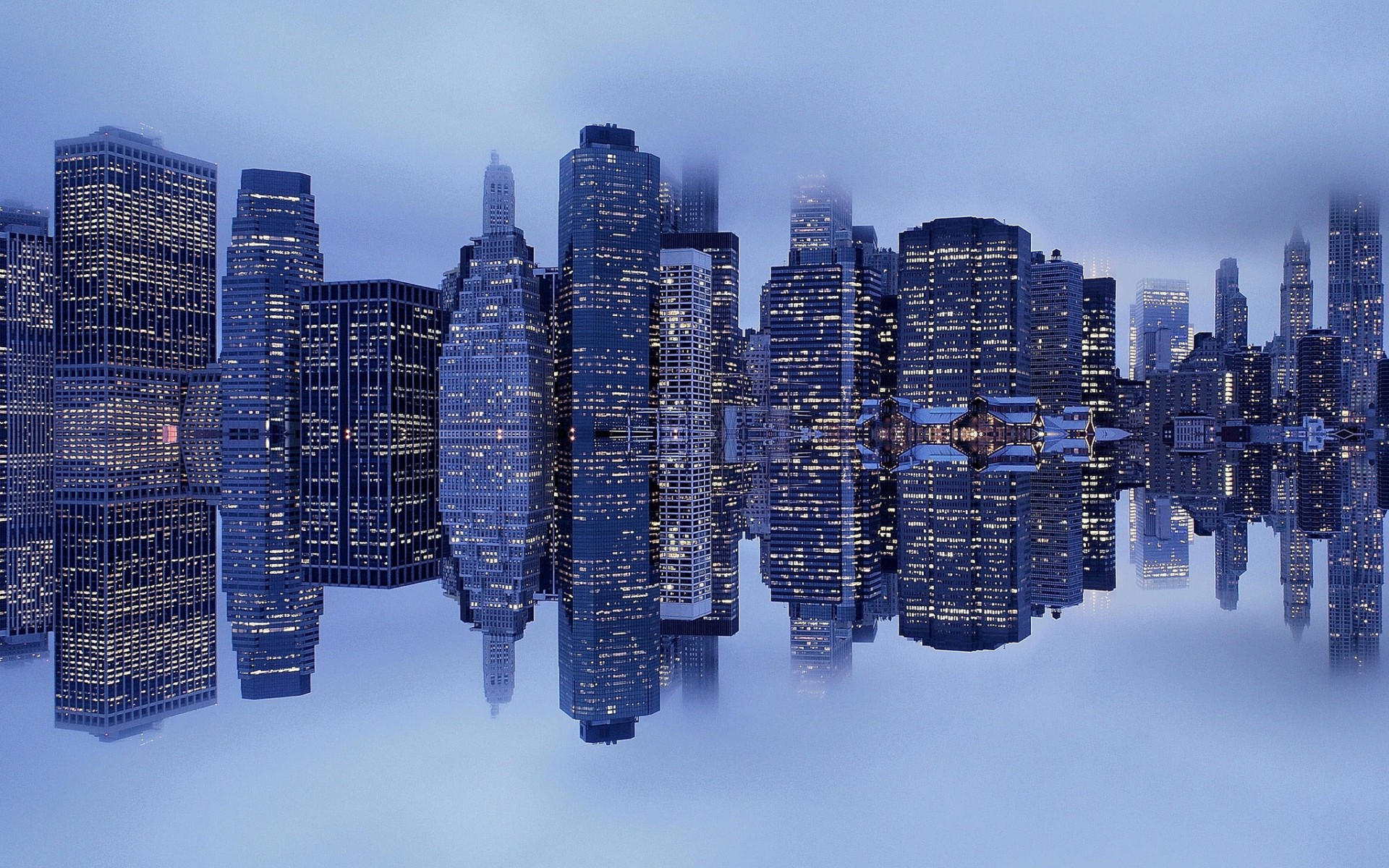 Description: A city skyline with skyscrapers and a reflection in the water at night time with fog and low light.