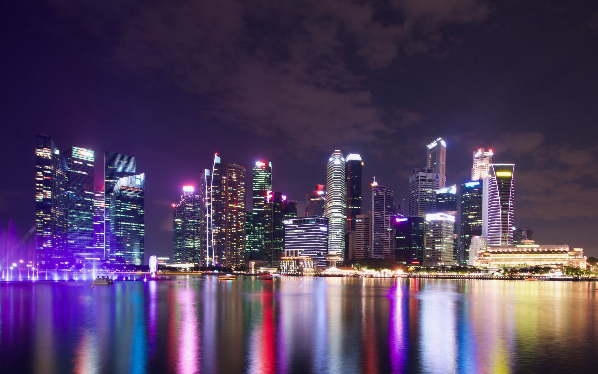 Description: A city skyline with a lot of lights reflecting in the water at night time with a lot of clouds.