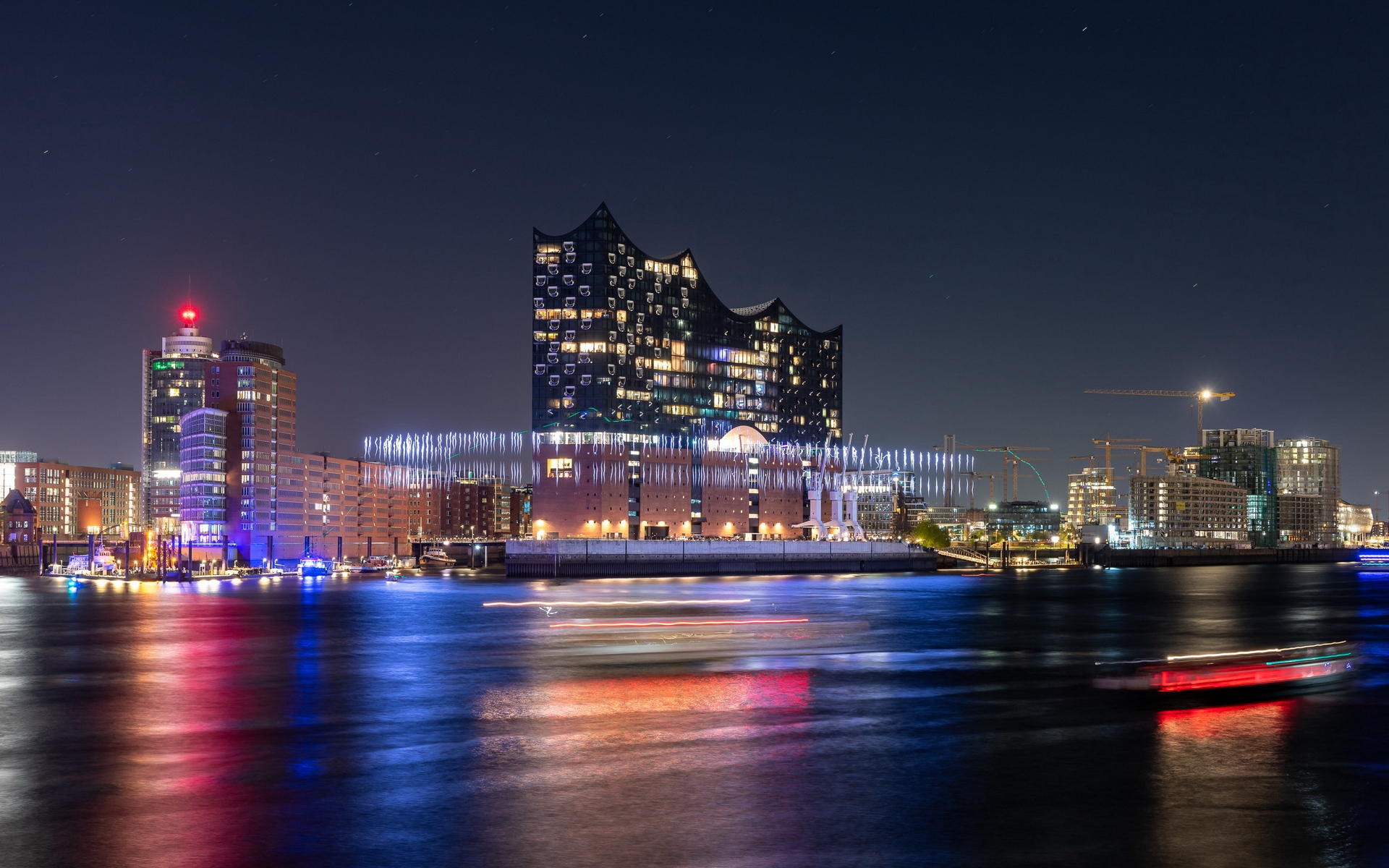 Description: A city skyline with a river and a bridge at night time with lights reflecting off the water and a boat in the foreground.