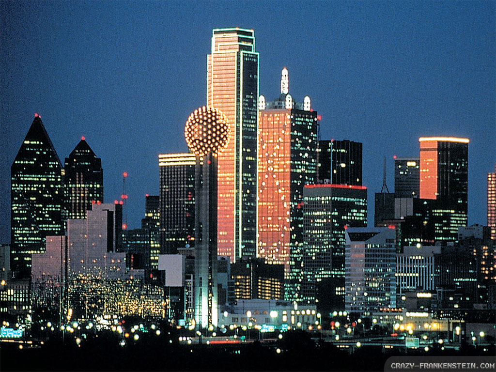 Description: A city skyline with a lot of tall buildings lit up at night time with a lot of lights on.