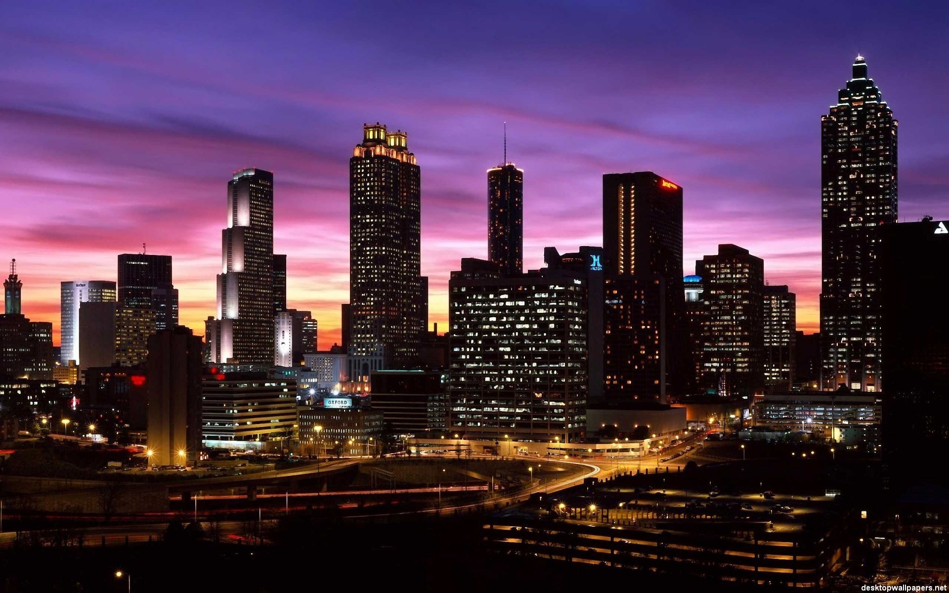 Description: A city skyline with a lot of tall buildings at night time with a purple and blue sky in the background.