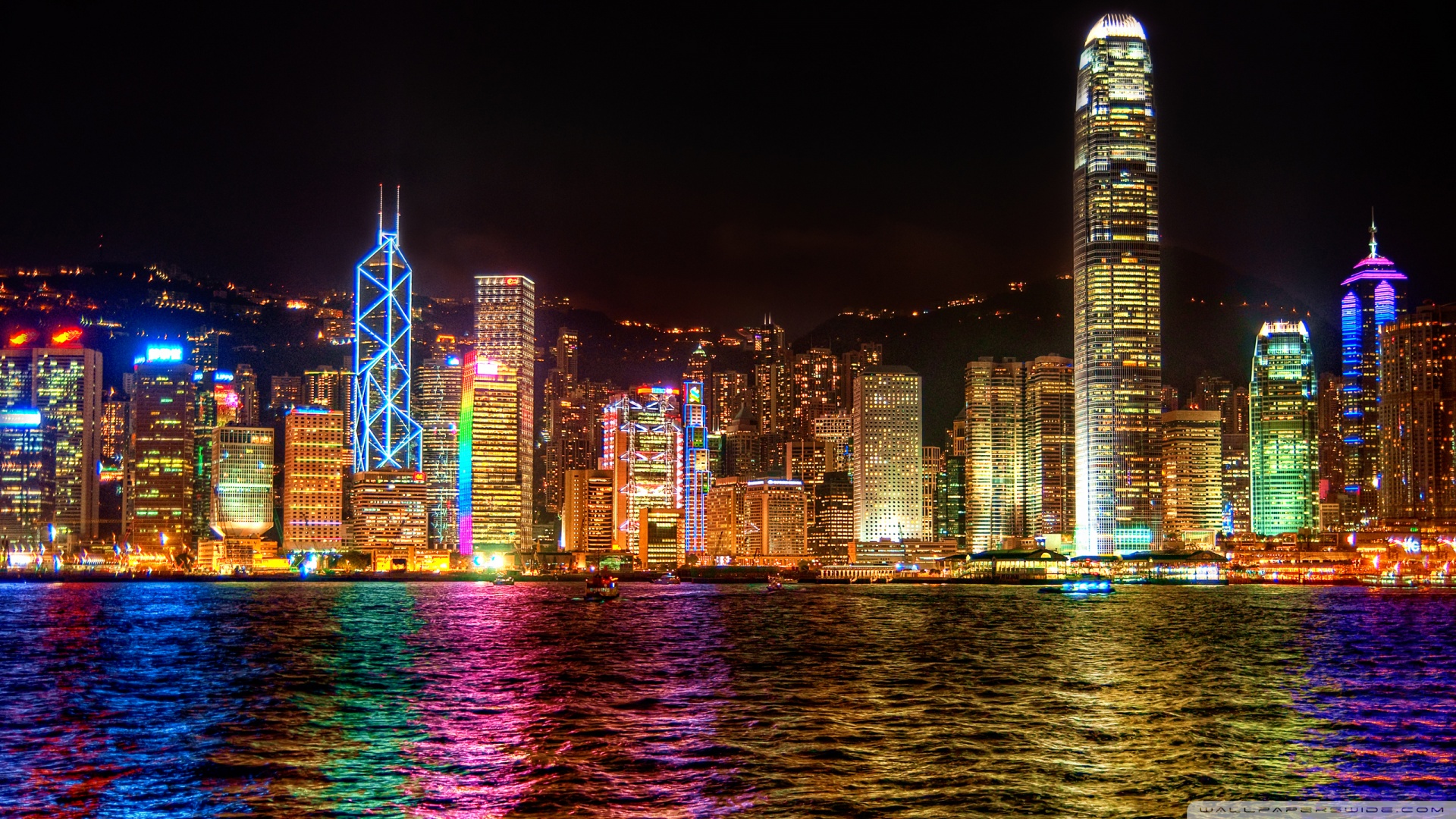 Description: A city skyline with a lot of tall buildings lit up at night time with bright lights on the water.
