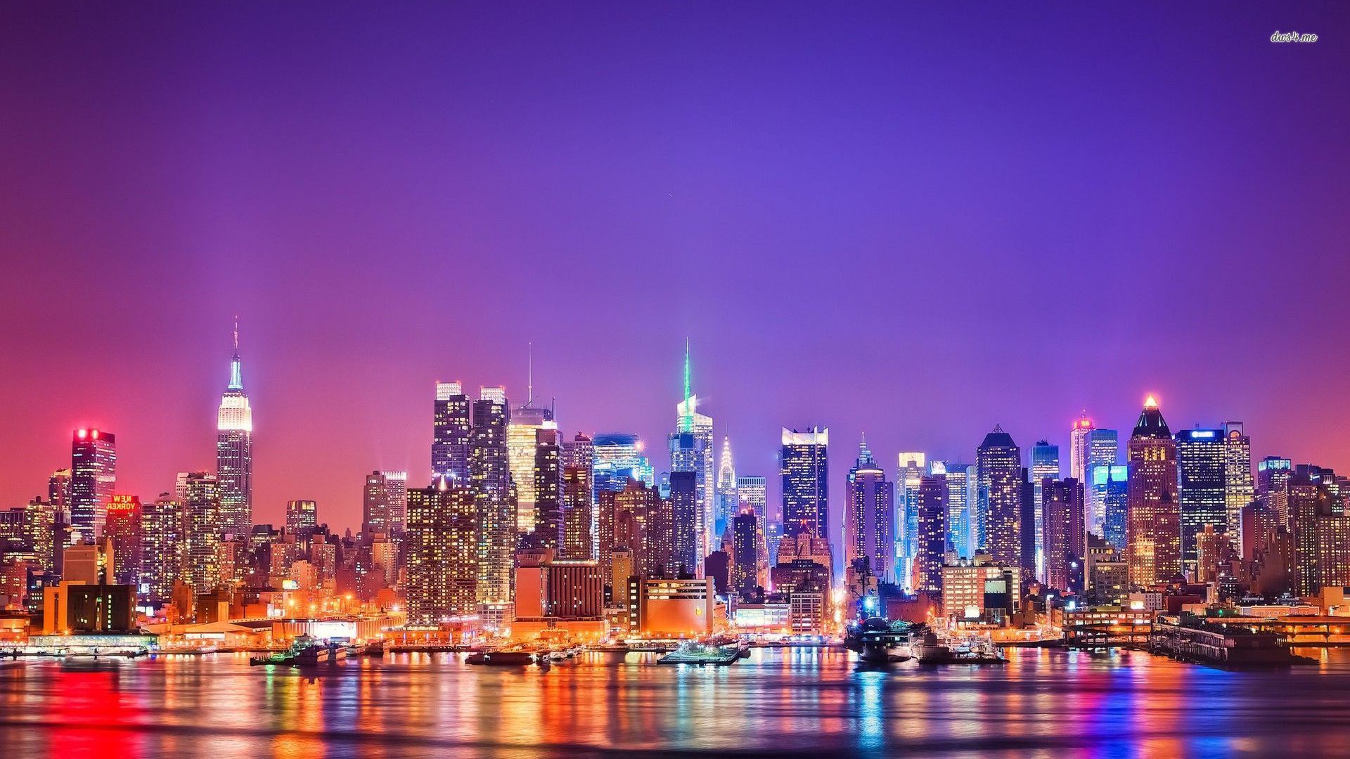 Description: A city skyline with a lot of tall buildings at night time with lights on the buildings and the water.
