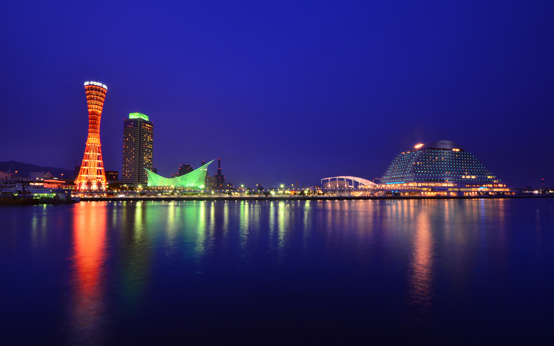 Description: A city skyline with a large tower and a large building lit up at night with lights reflecting in the water.