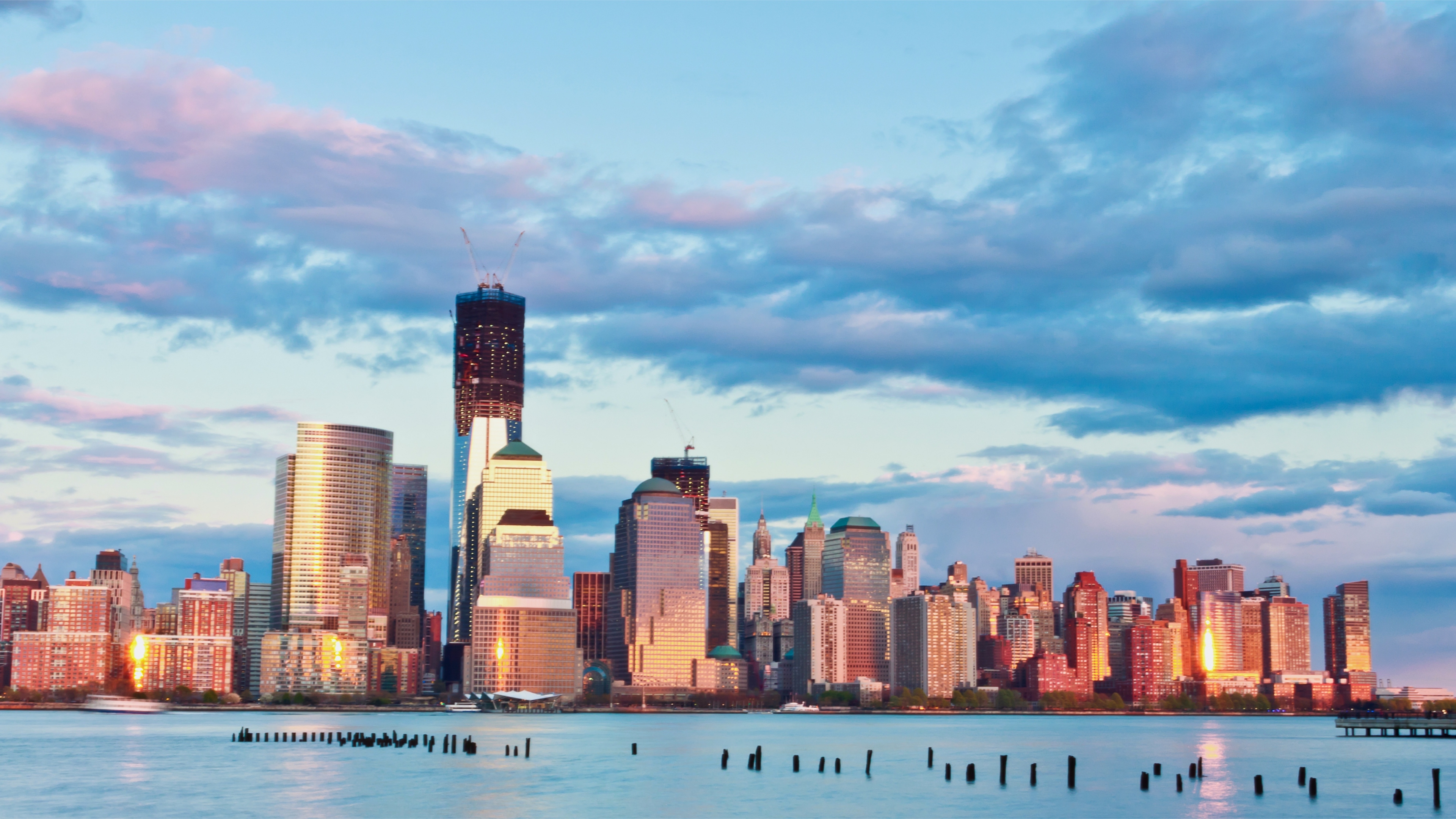 Description: A city skyline with a large body of water in front of it and a cloudy sky above it with a few clouds.