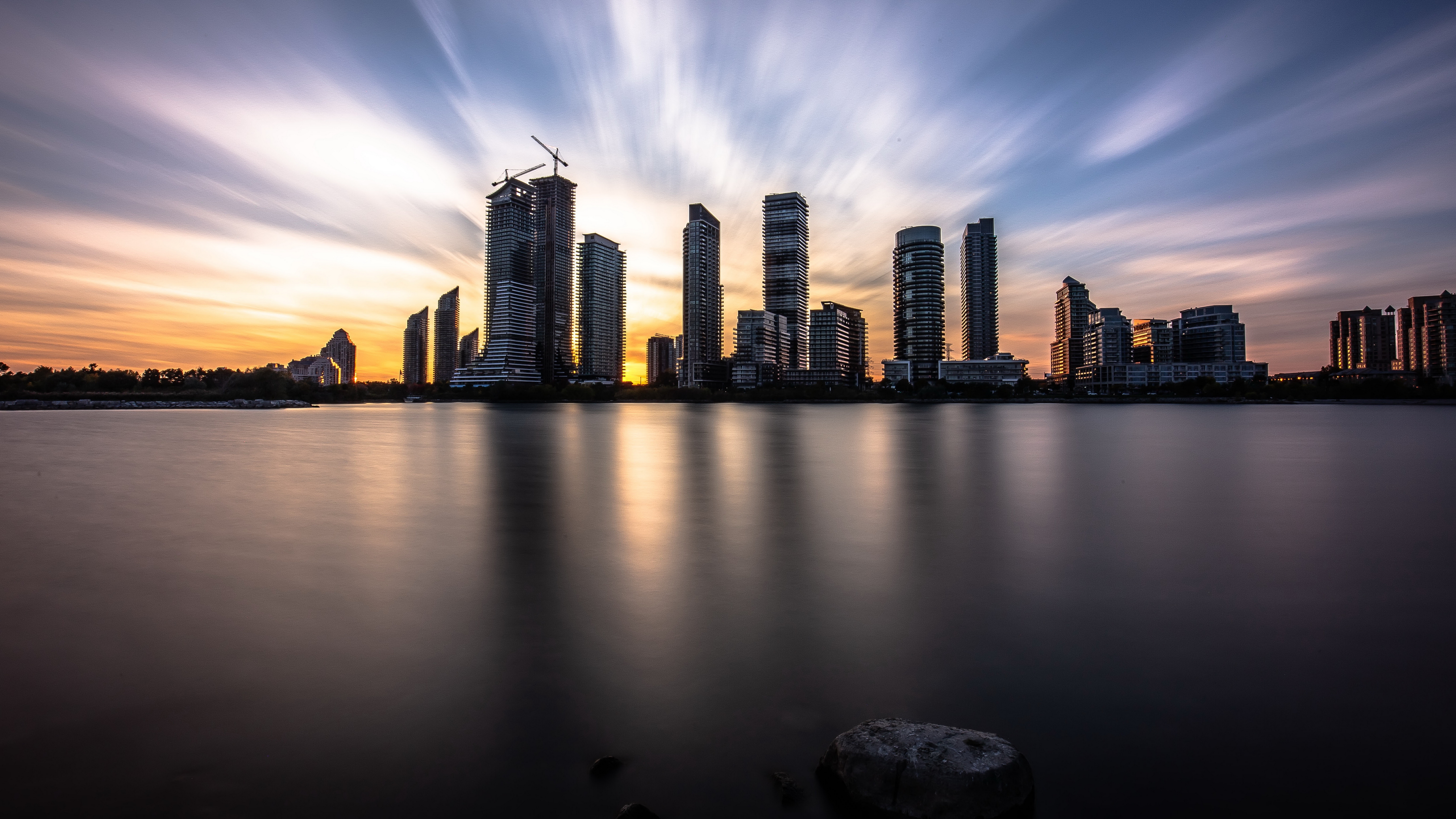 Description: A city skyline with a body of water in front of it and a cloudy sky above it with a few clouds.