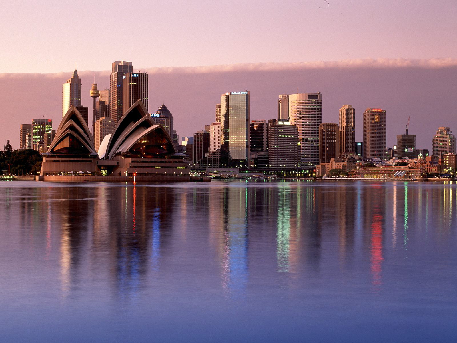 Description: A city skyline with a large body of water in front of it and a large body of water in front of it.