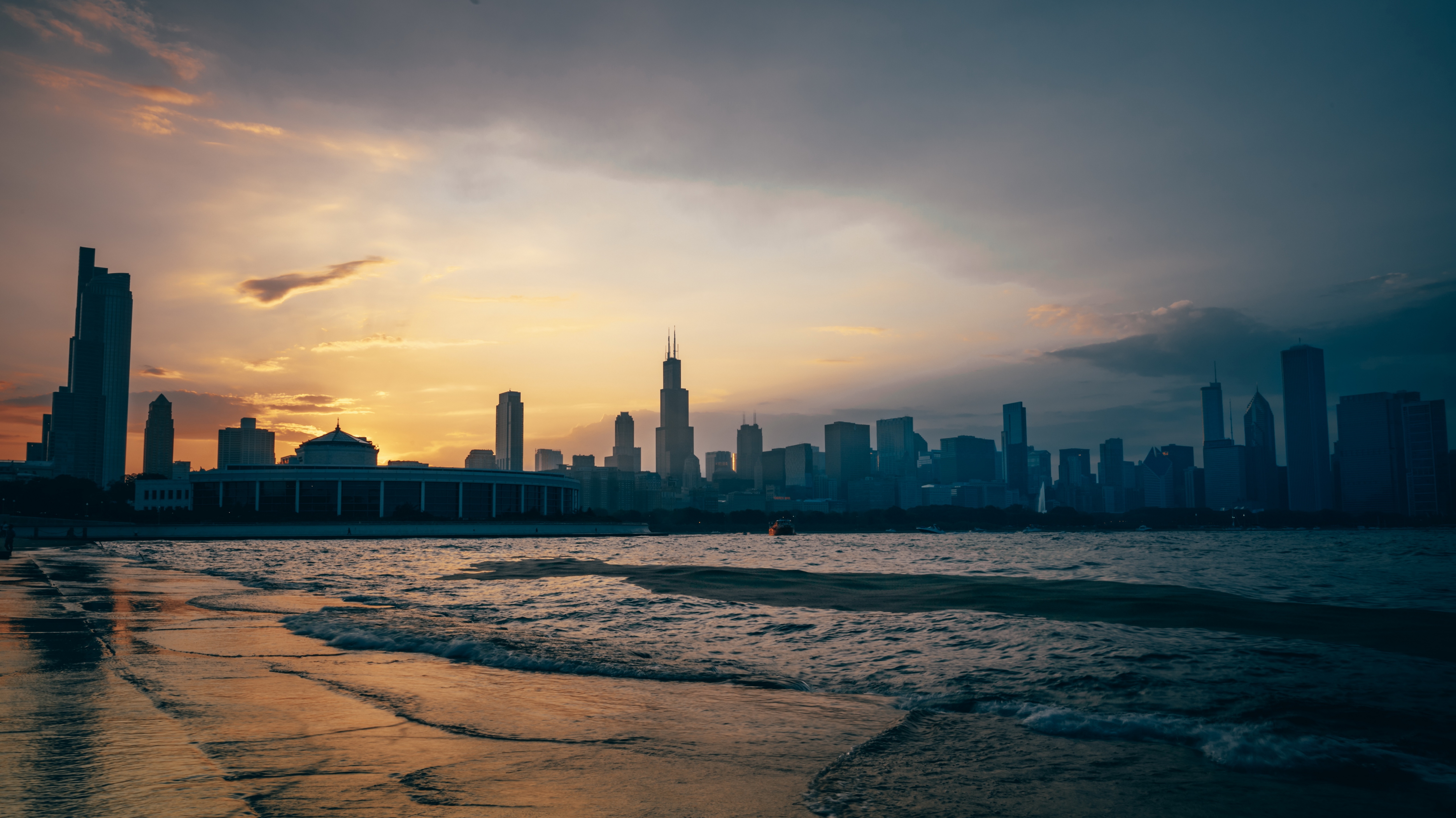 Description: A city skyline with a body of water in front of it and a sunset in the background with a few clouds.