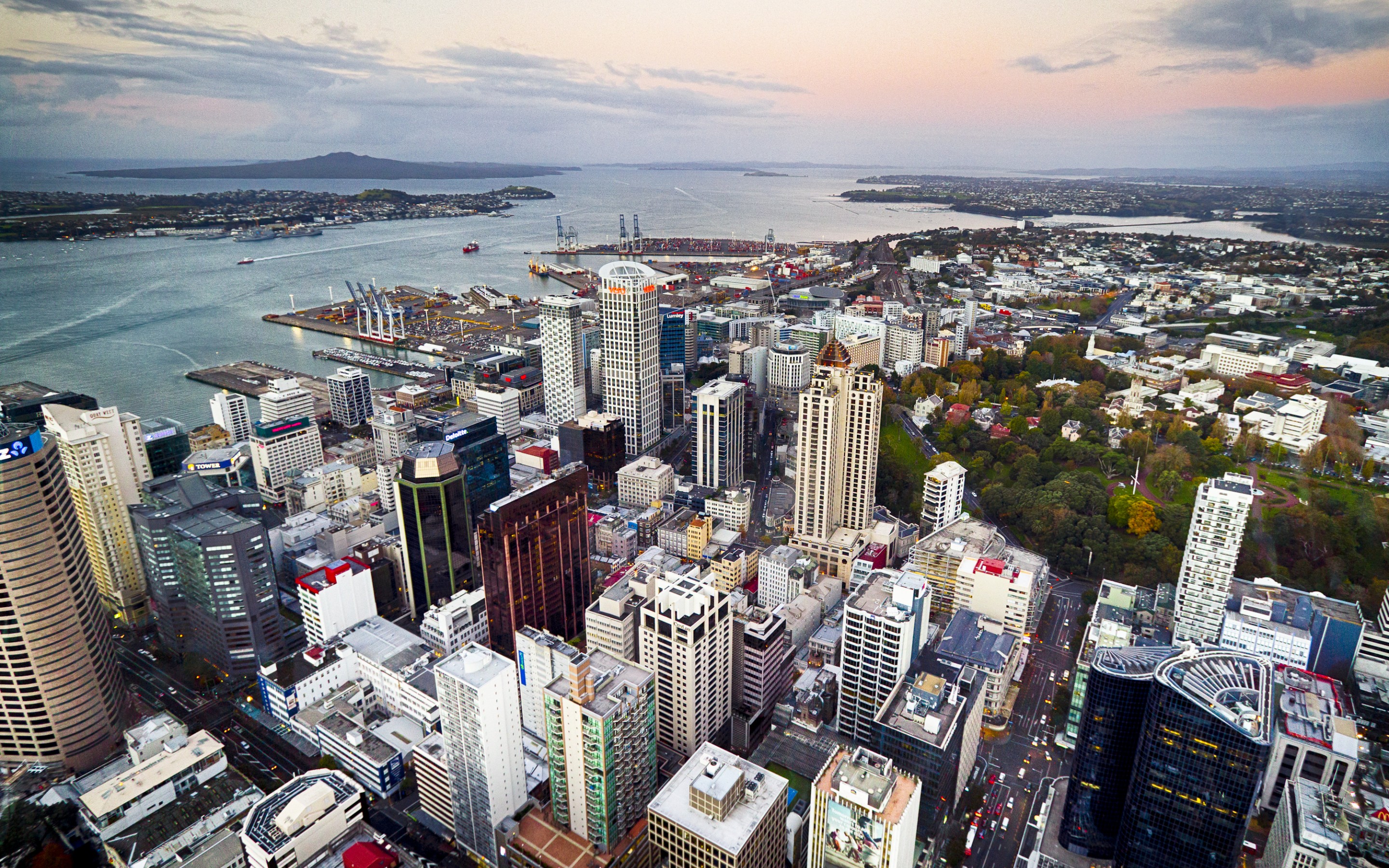Description: A city with a lot of tall buildings and a body of water in the background with a sunset in the sky.