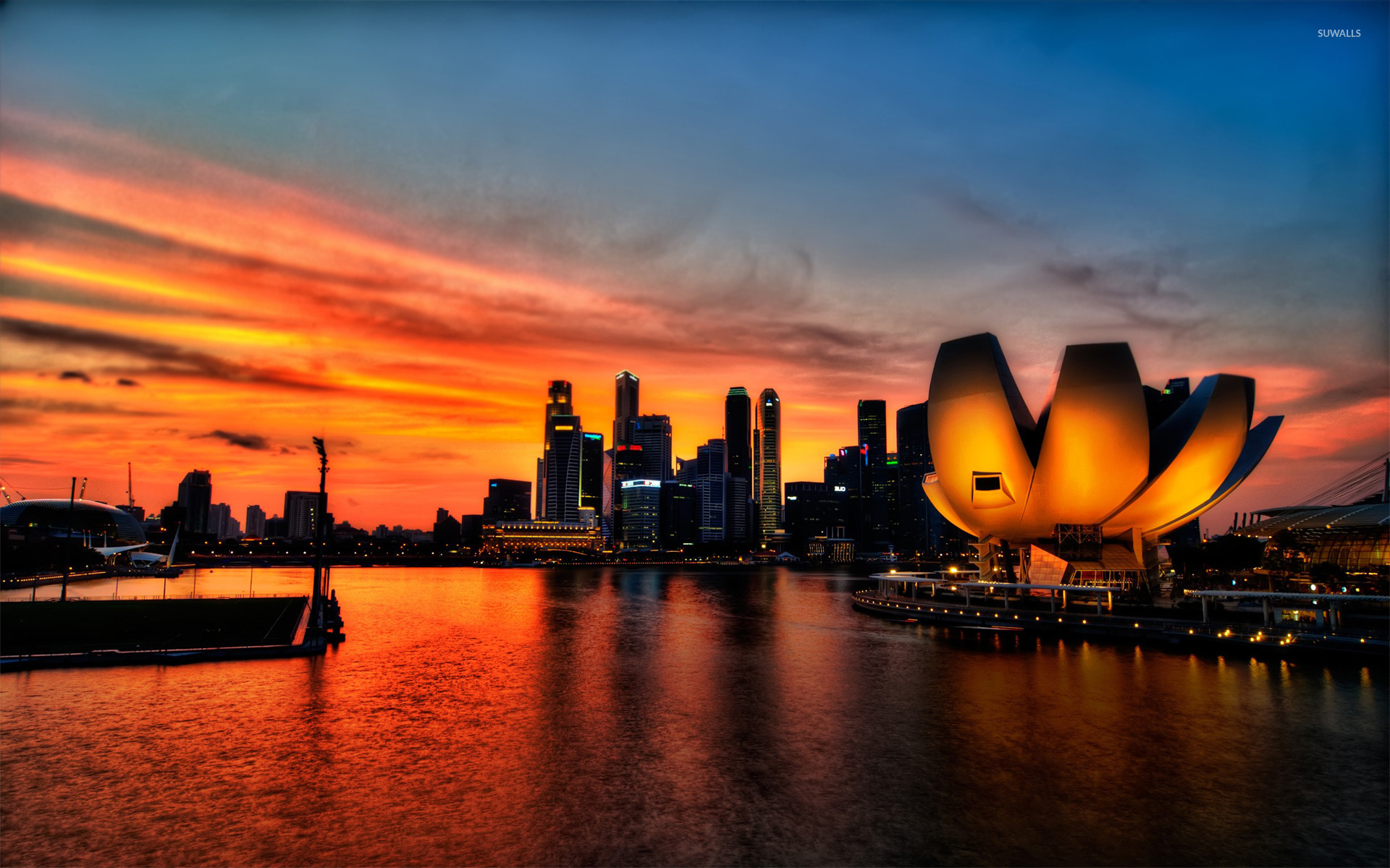 Description: A city skyline with a large yellow flower in the foreground and a body of water in the foreground.