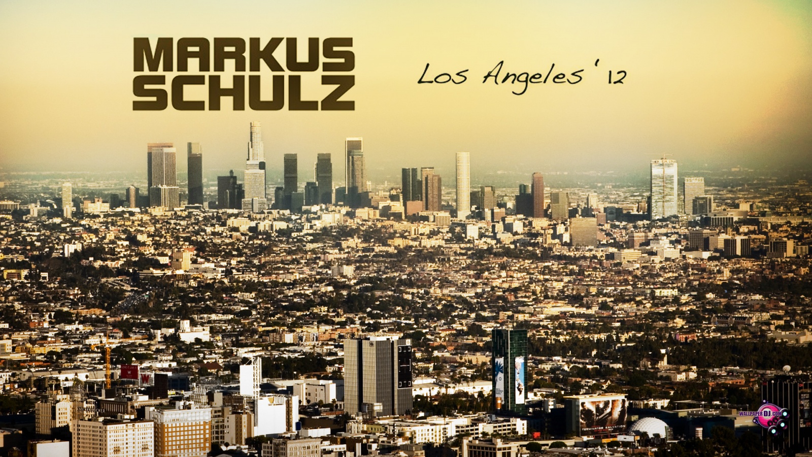 Description: A city skyline with a yellow sky and a yellow sky background with the words markus schuz.