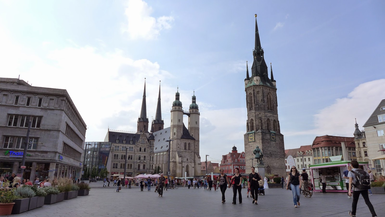 Description: A group of people walking around a city square with tall buildings in the background and a clock tower in the middle.