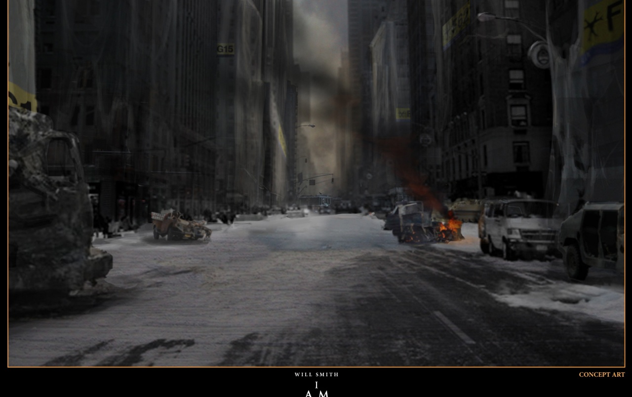 Description: A city street with cars and people on it in the snow and a sky background with a few clouds.