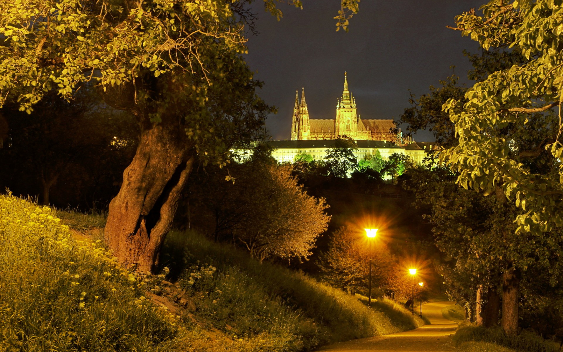 Description: A city street with a castle in the background at night time with a person walking down the street at night.