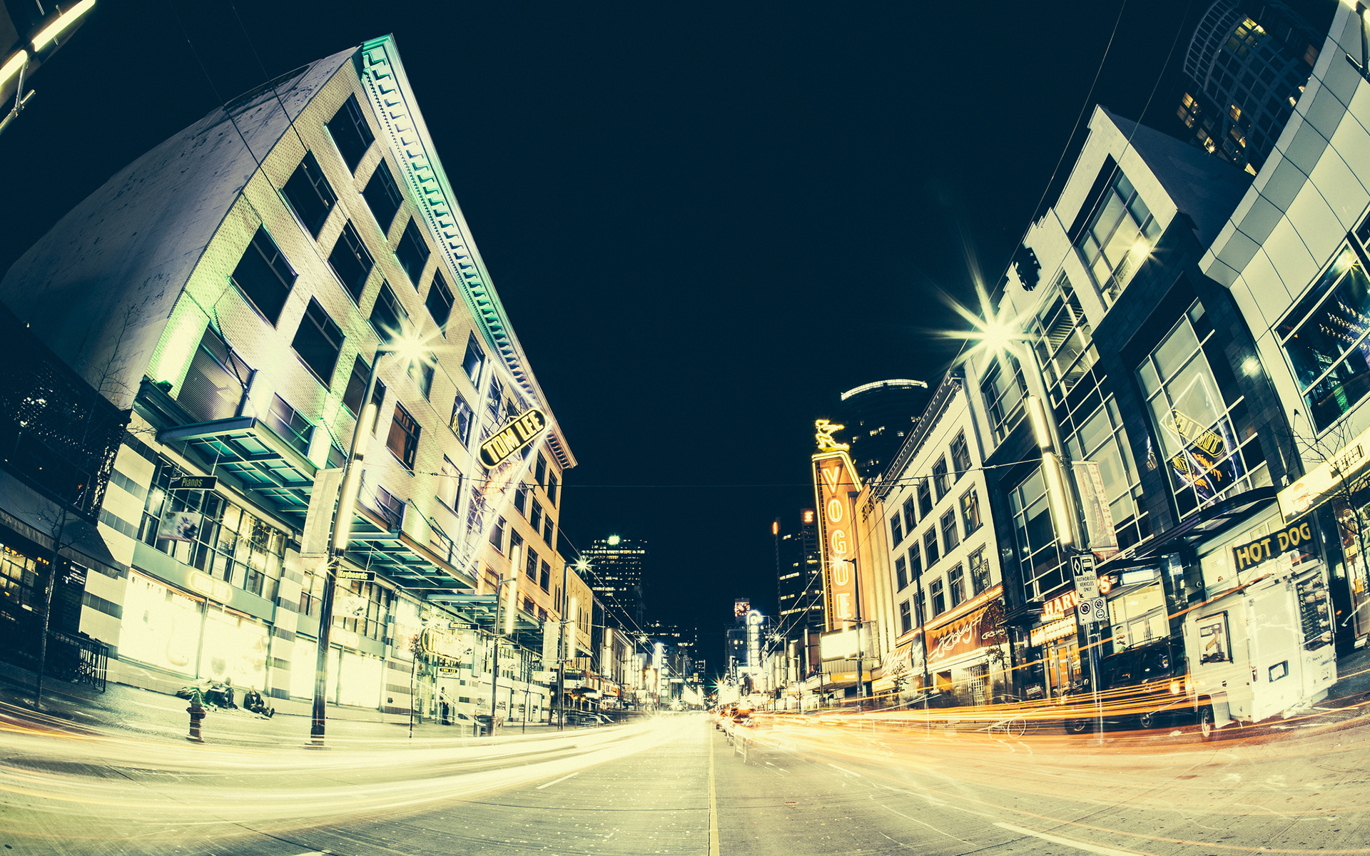 Description: A city street with a building and a clock tower in the background at night time with a long exposure of light.