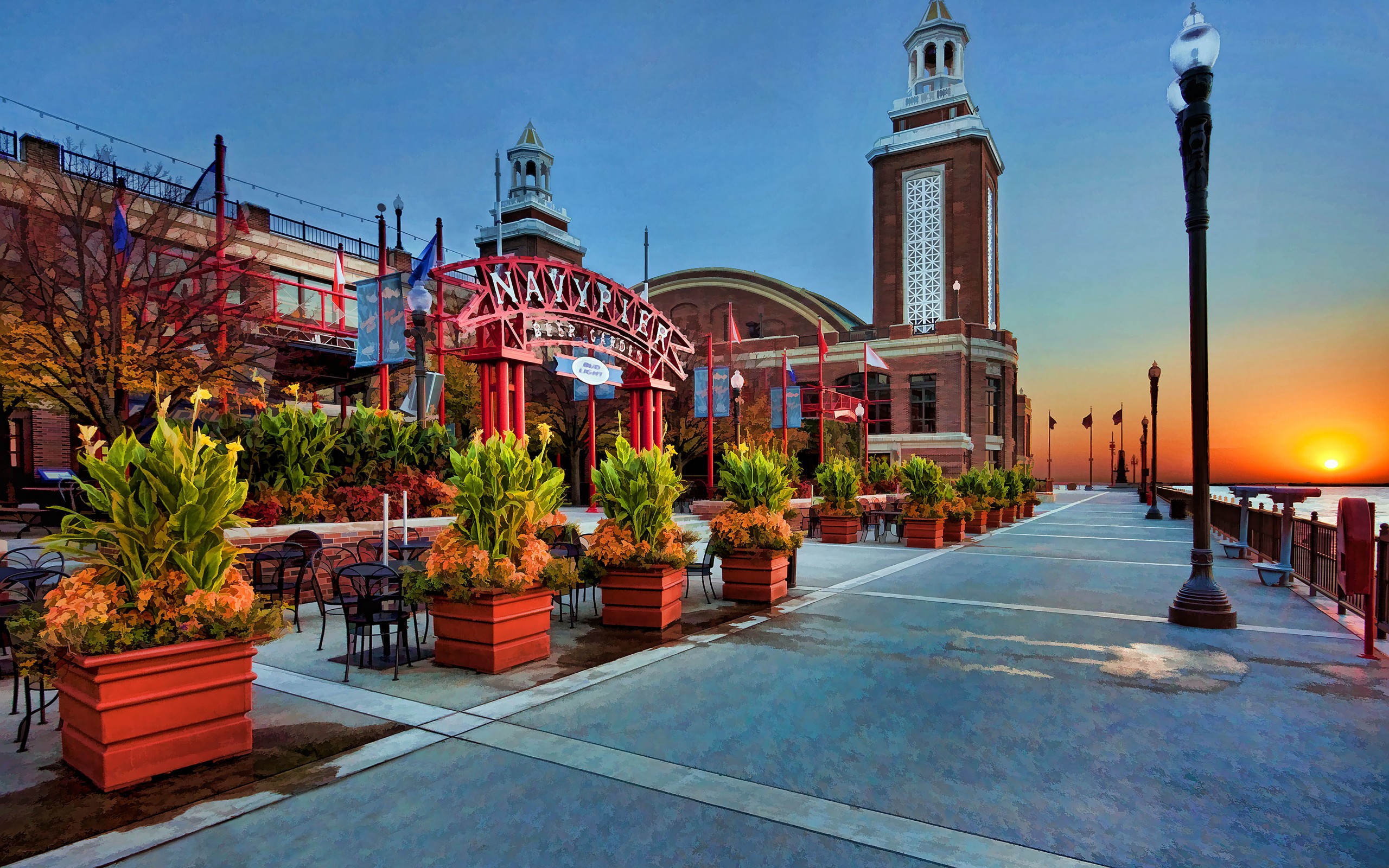 Description: A city street with a clock tower in the background and a restaurant with a clock on it's side.