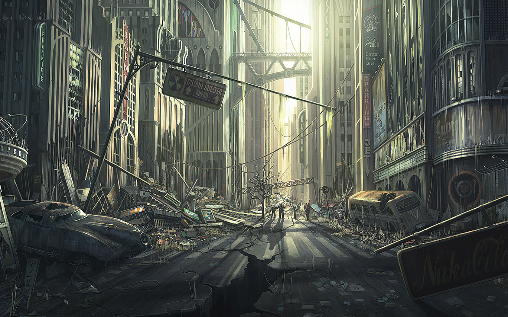 Description: A city street with a lot of debris and a person walking down the street in the distance with a sign.