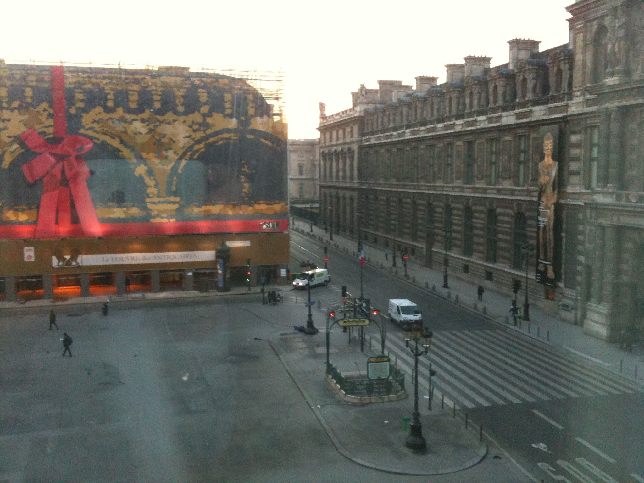 Description: A city street with a large building with a red bow on it's side and a street light.