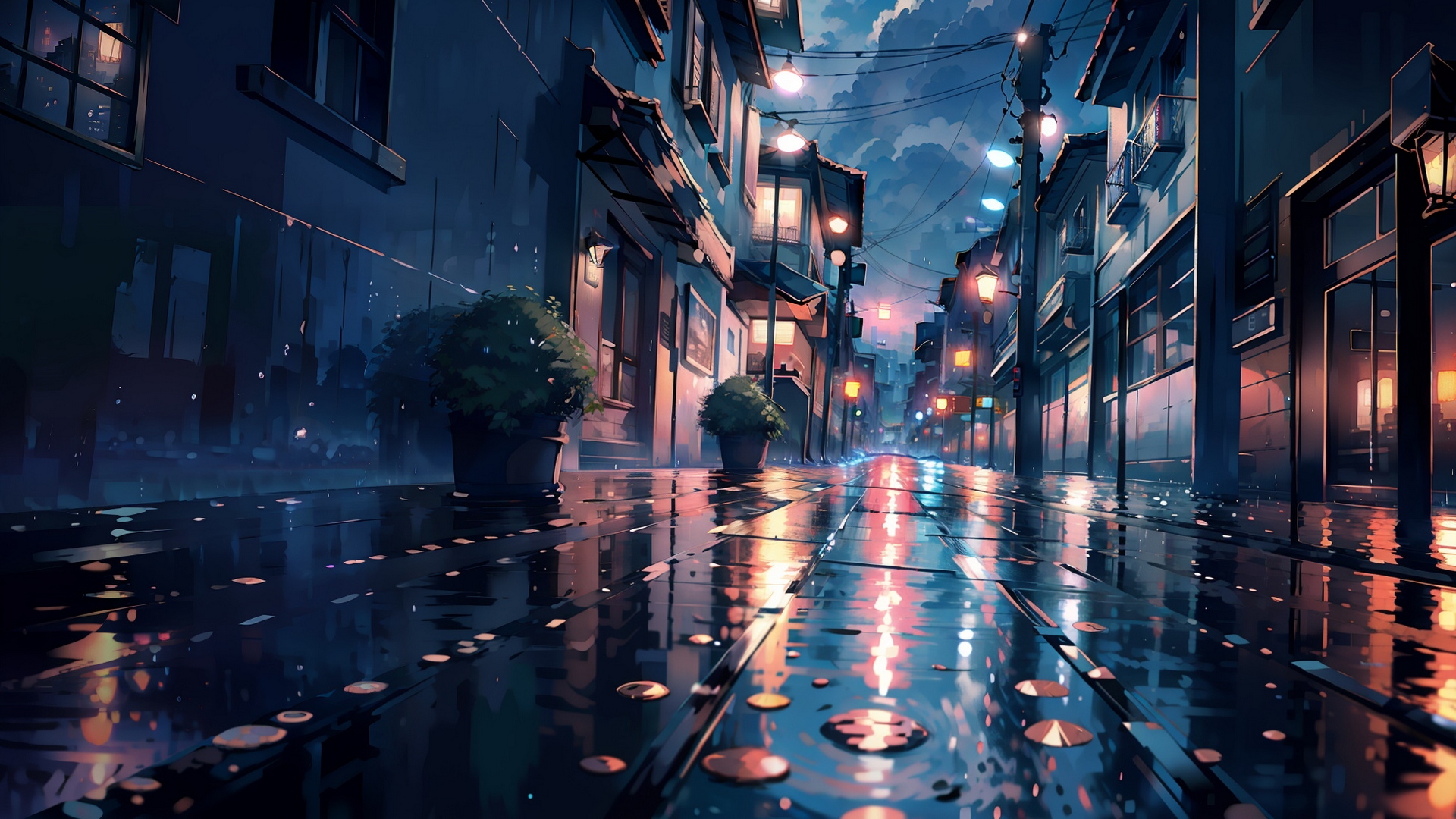 Description: A city street at night with rain falling on the ground and a potted plant on the sidewalk with lights on.