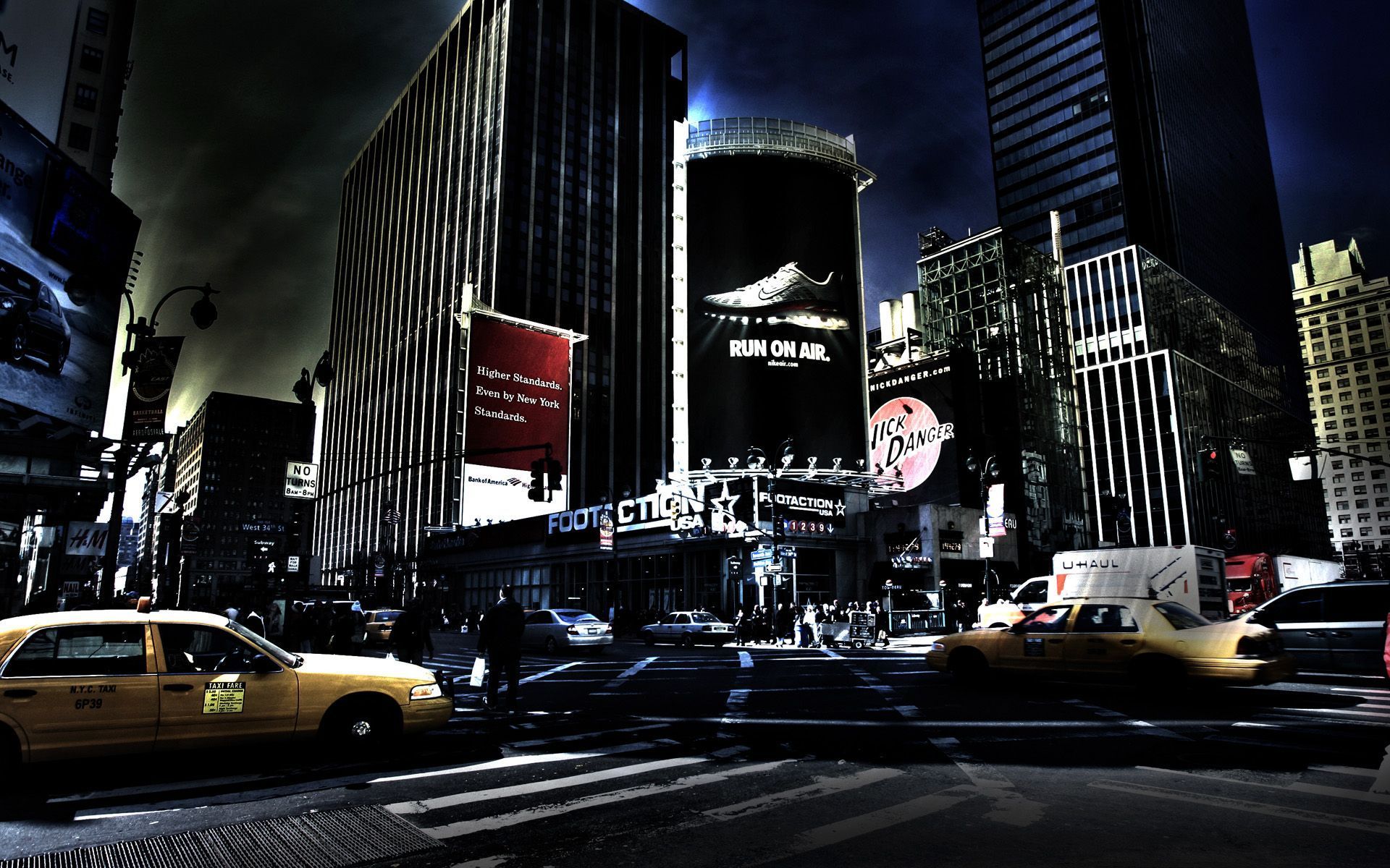 Description: A city street with cars and people on it at night time with a lot of tall buildings and a lot of traffic.