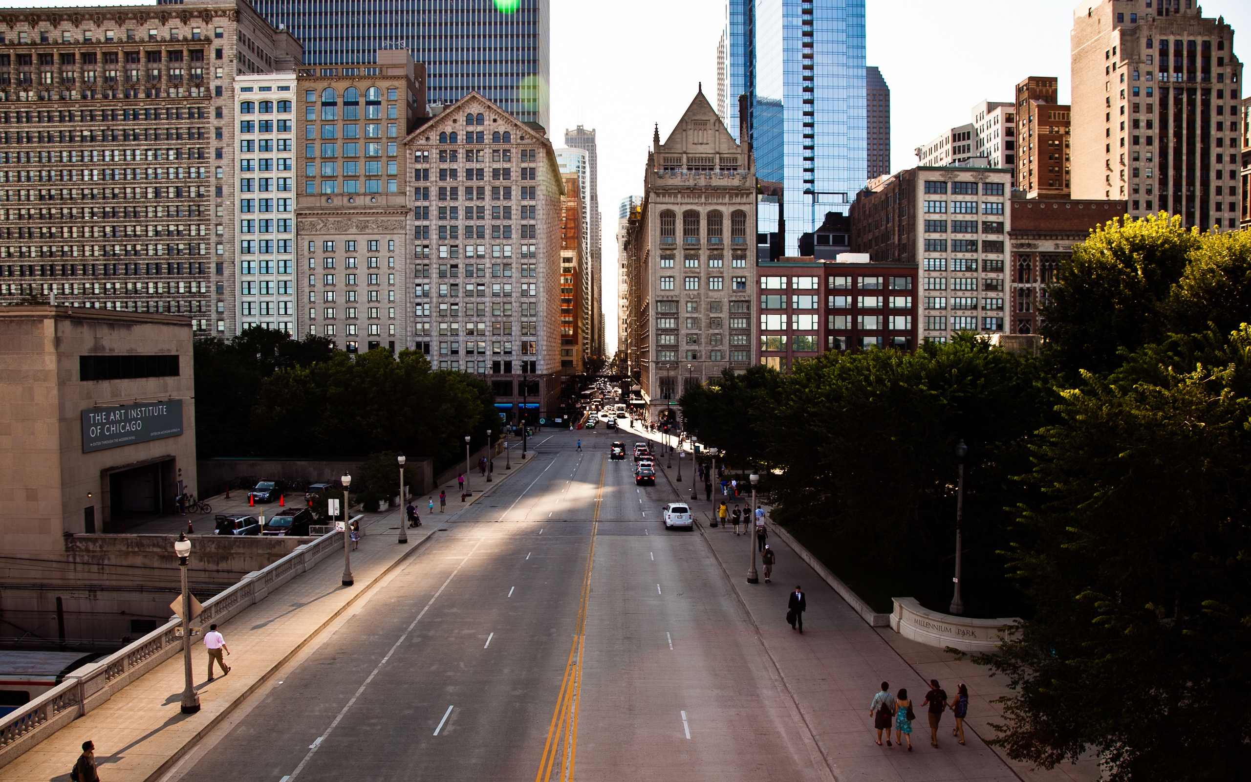 Description: A city street with people walking on the side of it and tall buildings in the background with a green light.