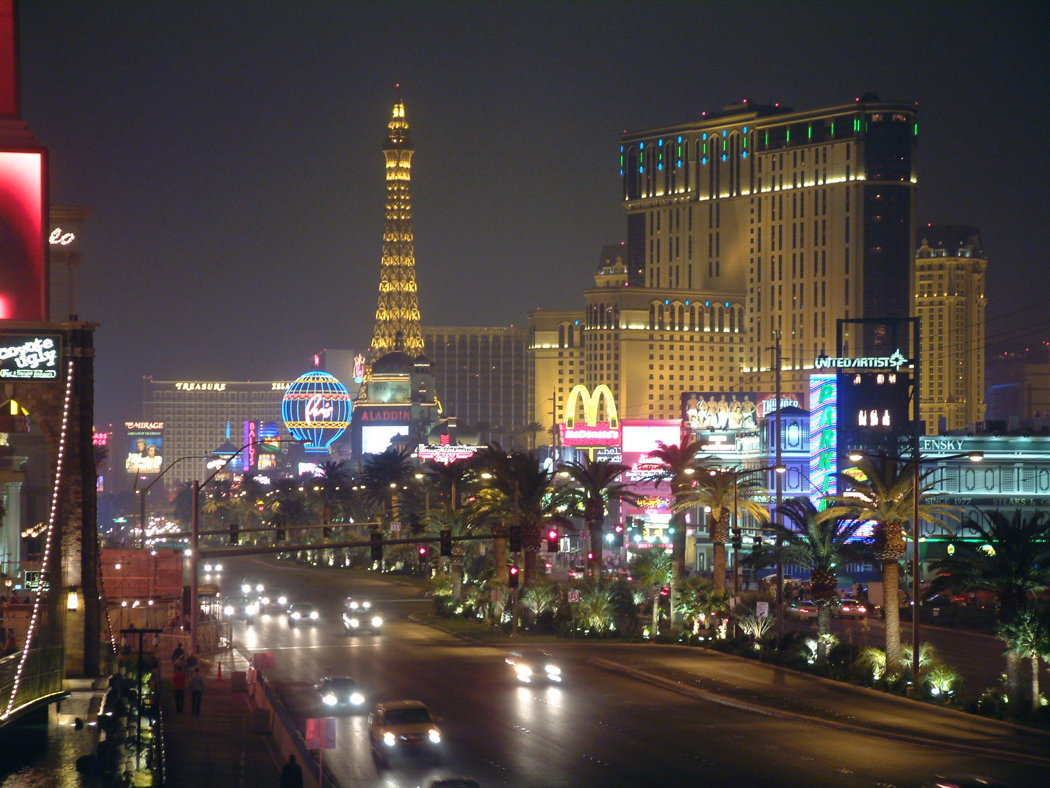 Description: A city street with a lot of traffic and tall buildings in the background at night time with lights on.