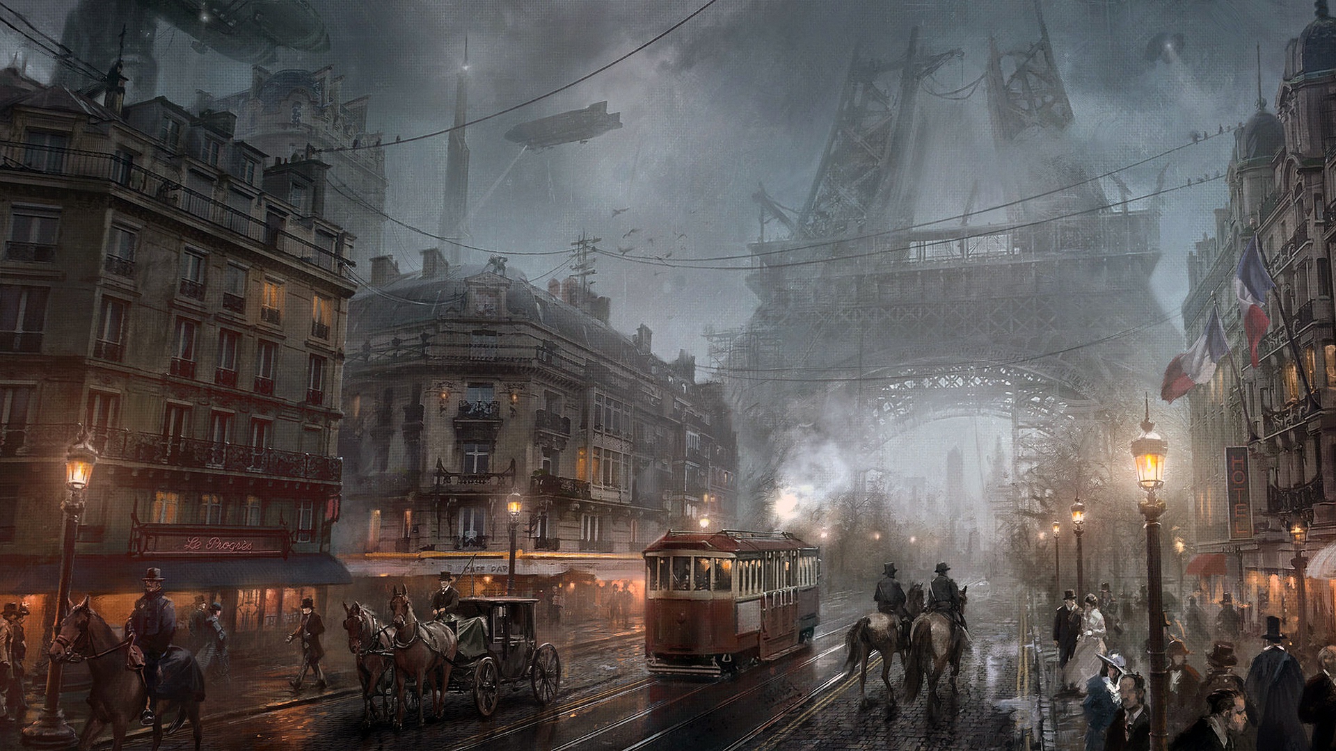 Description: A painting of a city street with a trolley and people walking on the sidewalk and a train on the tracks.