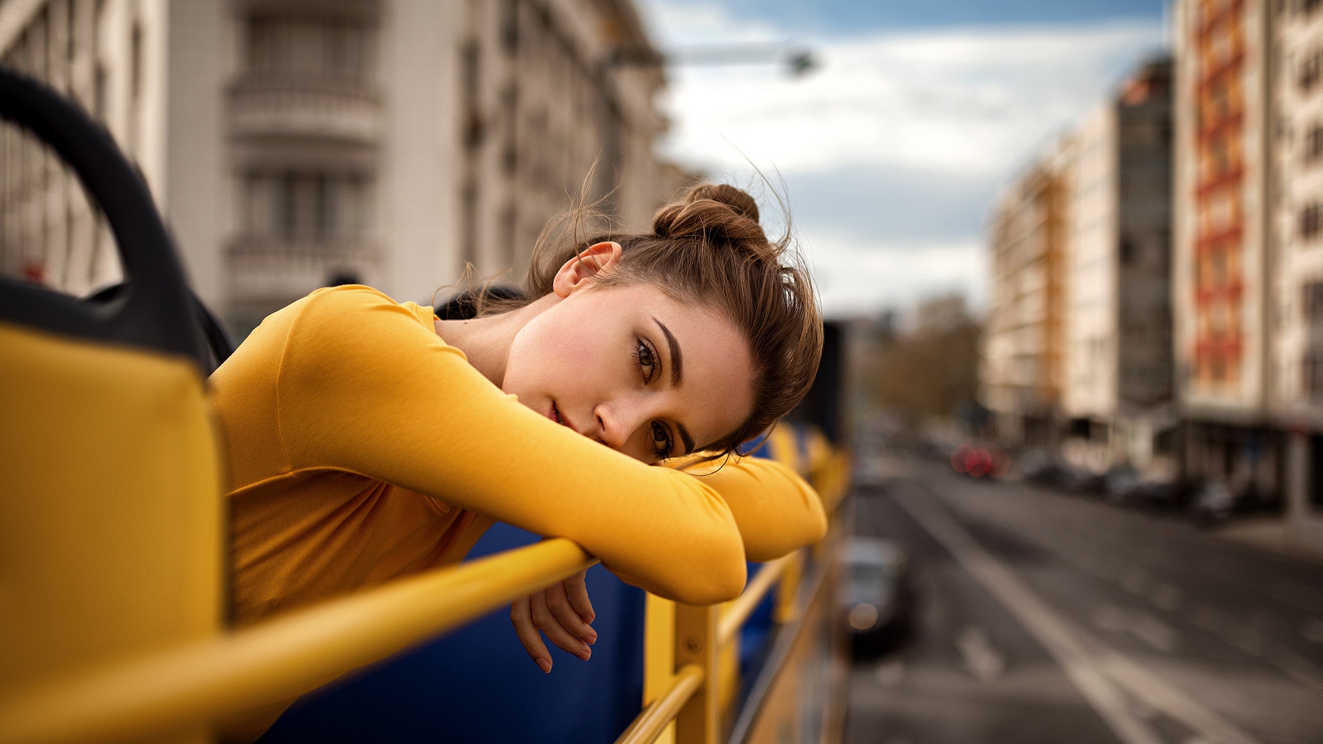 Description: A woman leaning on a rail in a city street with buildings in the background and a yellow fence around her.