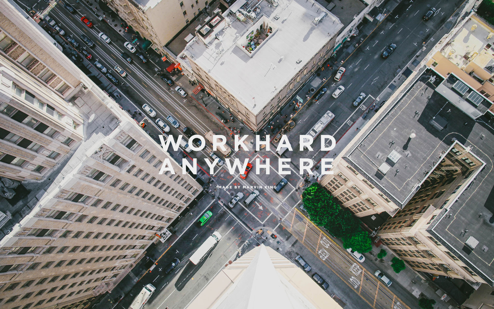 Description: A city with a very tall building and a street below it with the words work hard anywhere on it.