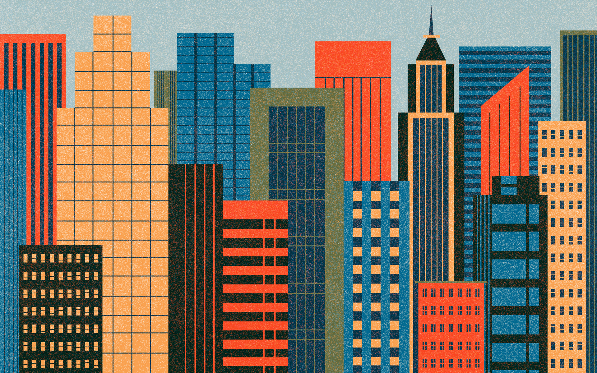 Description: A city with tall buildings and a clock tower in the middle of it's skyline.